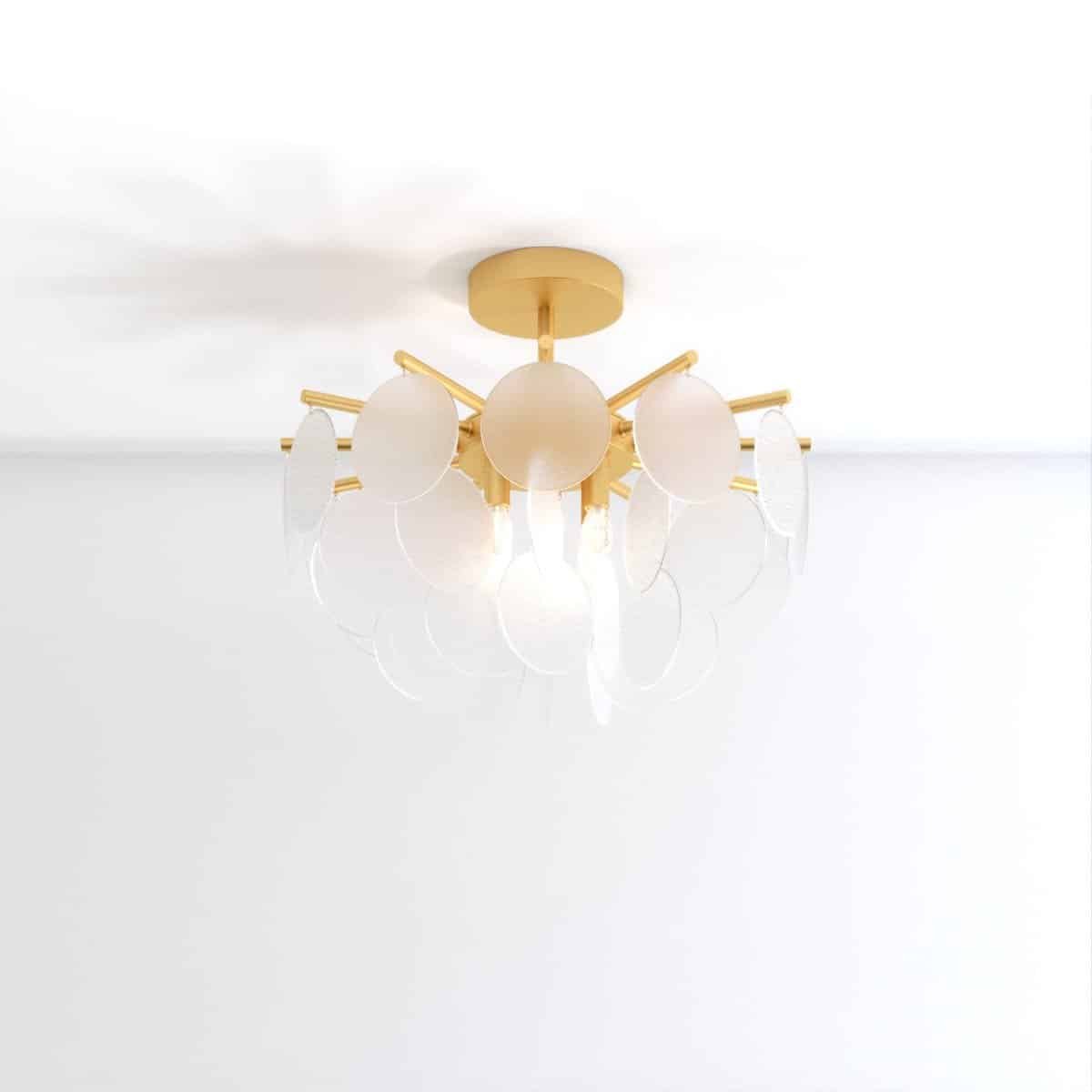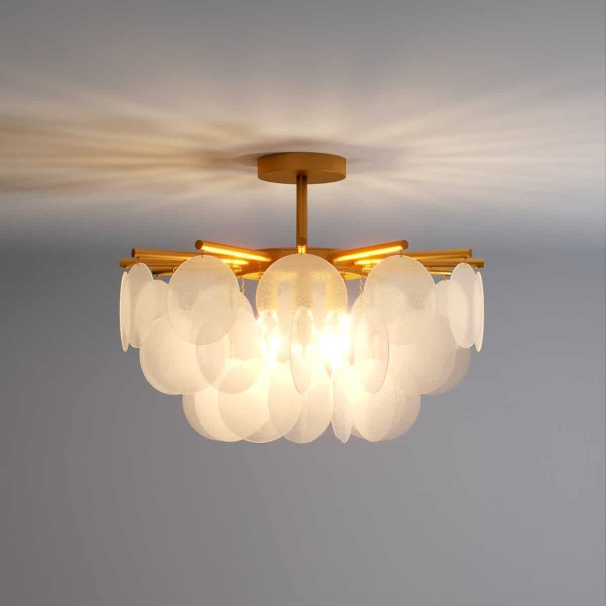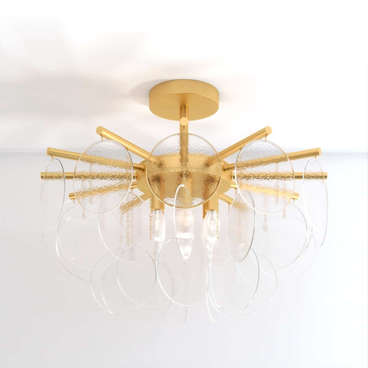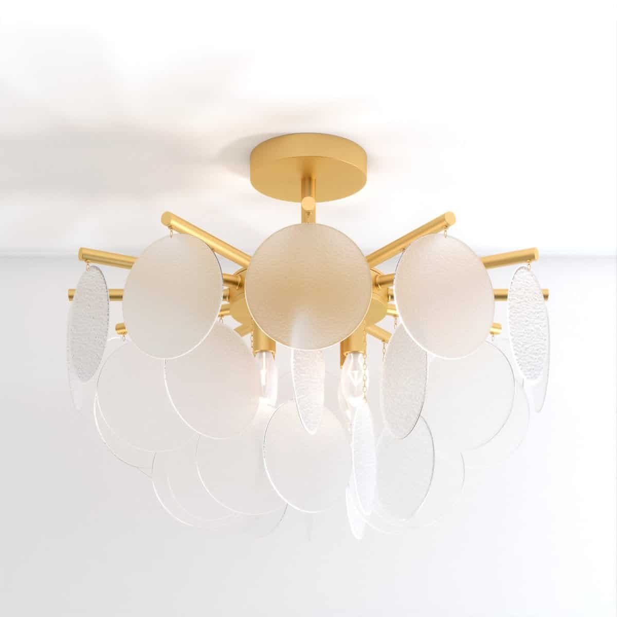 Prepare to be immersed in a world of luminous grandeur as the Isla Chandelier becomes the centerpiece of your room. Its timeless allure is embodied in a classic gold-finished frame, embellished with exquisite glass discs that feature a bubbled texture. These discs, gracefully scatter and refract light, resulting in a celestial luminescence that envelops your surroundings. The chandelier adds an air of opulence and splendor to any space it graces, leaving onlookers captivated by its beauty.