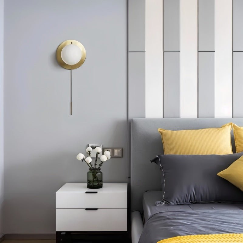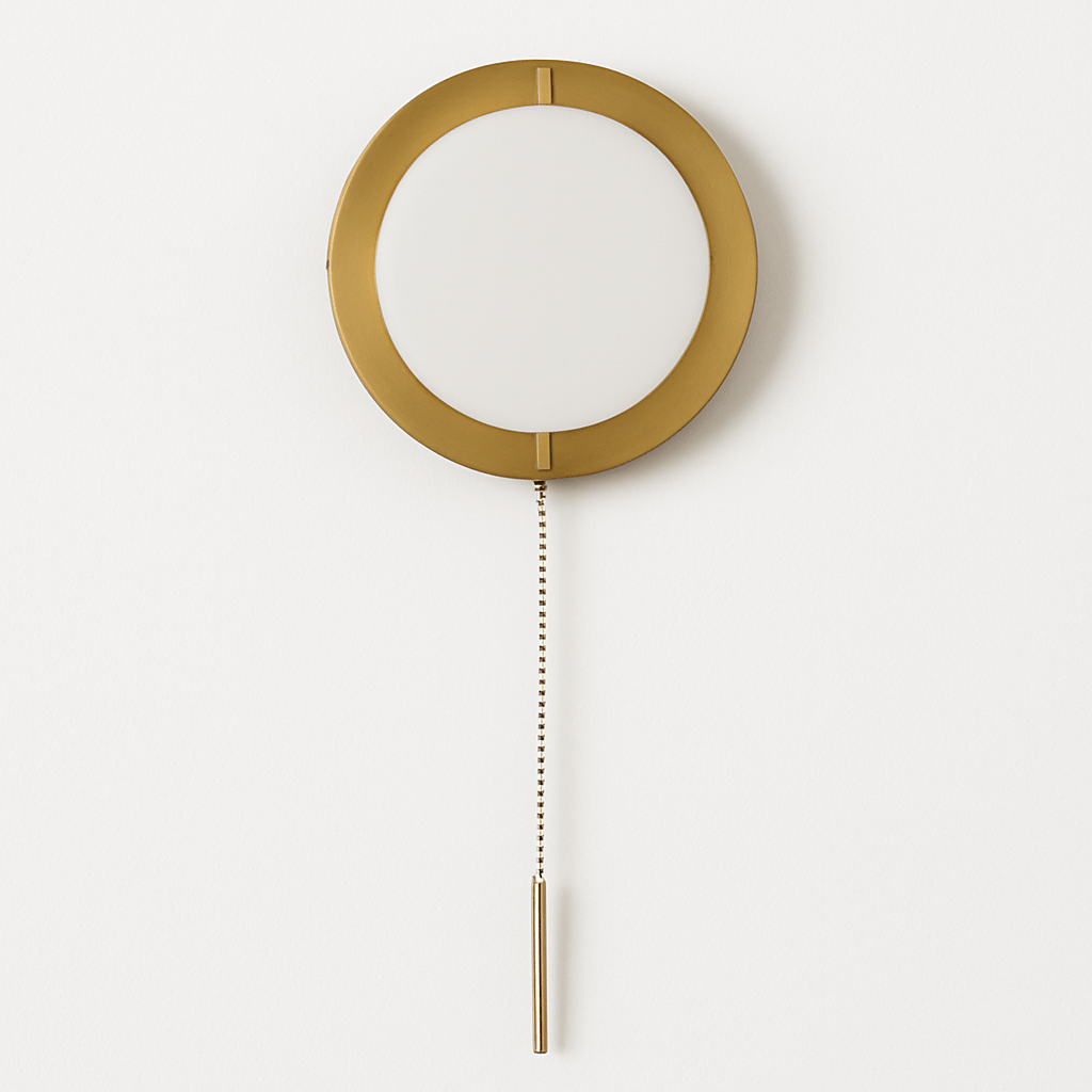 Jadani Light features a sleek gold finish circular base made of metal with a white globe light at the center, providing soft, warm lighting. Its simple and modern design is enhanced by a convenient pull chain for easy use. Perfect for adding a touch of elegance to hallway, bedroom, or living room, it complements various interior decor and styles.