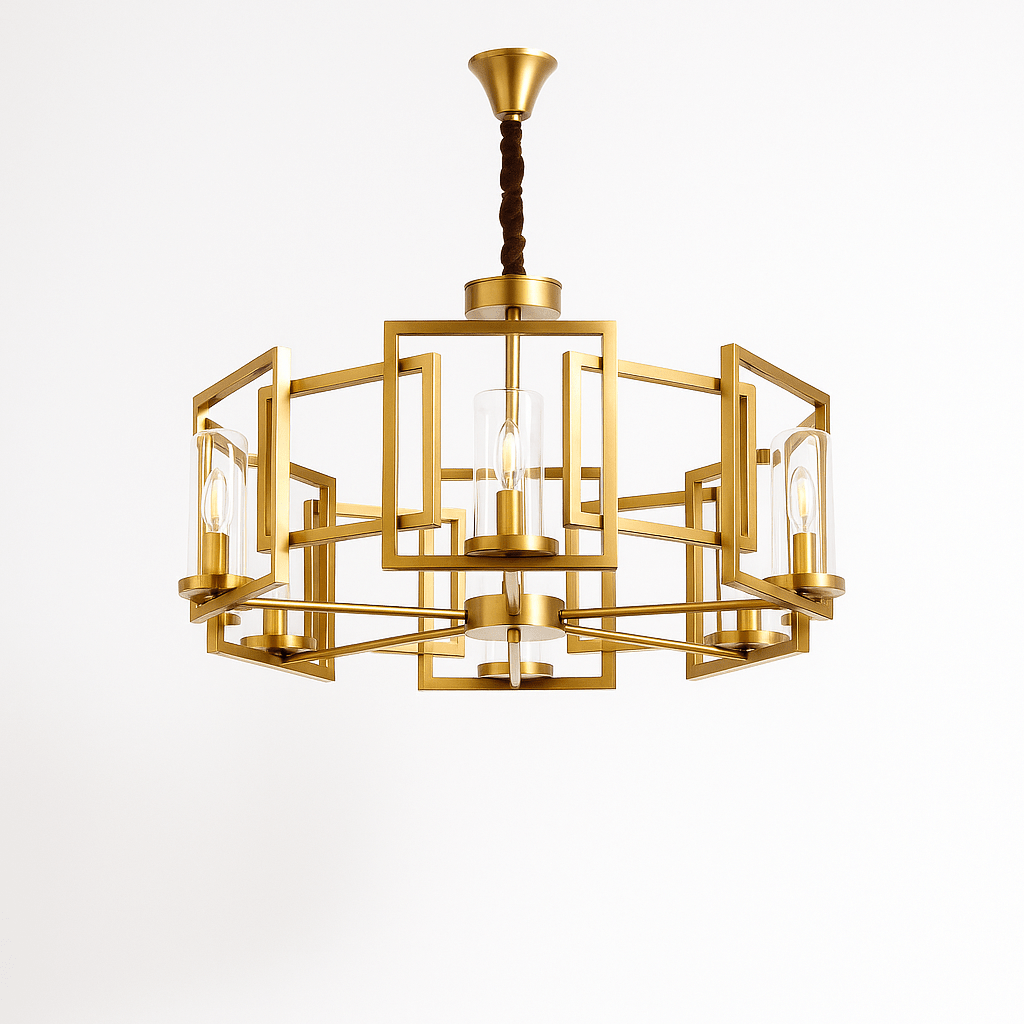 The Jalora Chandelier is a geometric iron and glass light fixture with a modern architectural design. Its structured frame, available in 6 and 8-head configurations, features open cubes surrounding cylindrical glass shades, diffusing a warm glow. Ideal for living rooms, dining areas, or entryways, this chandelier enhances contemporary and transitional interiors. The durable iron construction ensures longevity, while the suspended design creates a striking focal point.