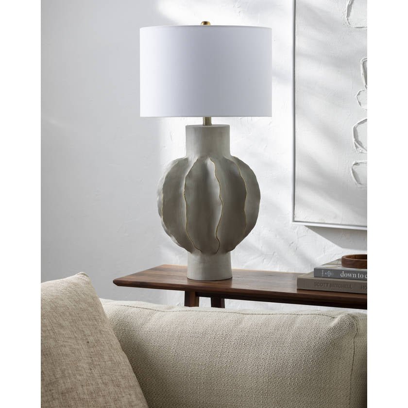 - Colors: Body: Light Gray; Base: Light Gray; Shade (Outside): Cream; Shade (Inside): White; Finial: Metallic – Silver; Harp: Metallic – Nickel; Cord: Translucent
