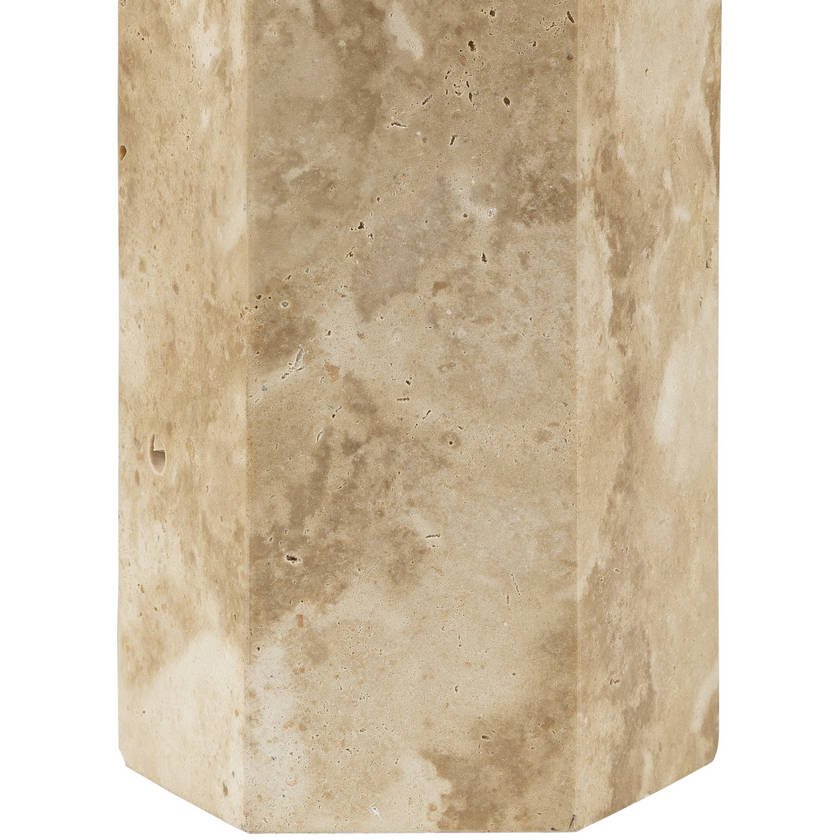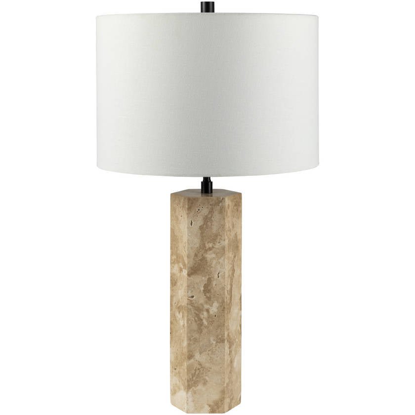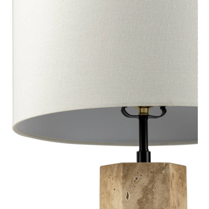 - Material: Body: Travertine, Iron; Shade (Outside): Linen; Shade (Inside): Polyester; Finial: Iron
