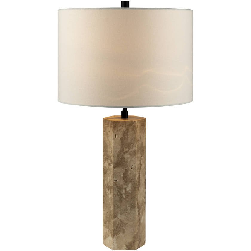 Illuminate your space with the Katalina accent table lamp, boasting a striking industrial rustic design that’s sure to make a statement in any room. The robust body combines the raw, natural beauty of travertine with the strength and durability of metal for an eye-catching contrast. Softening this bold look is a dual-layer shade crafted from linen on the outside and polyester on the inside, which provides a warm, inviting glow when illuminated. Topping off the design is a matching metal finial, adding an extra dash of style to this impressive 28-inch tall table lamp. Turn it on to experience not just light but also an atmosphere filled with character and charm.