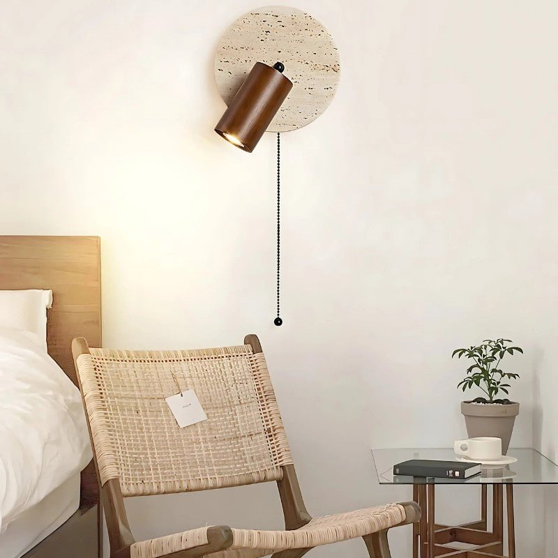 The Kenit Bedside Reading Lamp is a compact light fixture crafted from yellow travertine and wood, blending natural textures with a minimalist design. Its circular travertine backplate highlights unique stone patterns, paired with a sleek wooden cylindrical shade for a warm, modern contrast. Perfect for installation near beds, reading corners, or study areas, it provides focused illumination while enhancing the decor.
