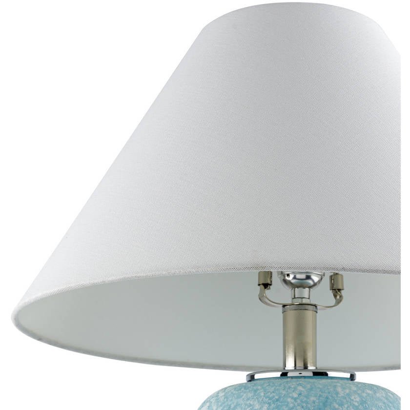 • Colors: Body: Blue; Shade: White; Finial: Clear; Harp: Metallic – Nickel; Cord: Translucent
