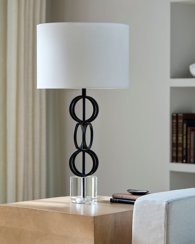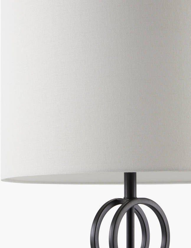 • Colors: Body: Black; Base: Clear; Shade: White; Finial: Black; Harp: Metallic – Nickel; Cord: Translucent