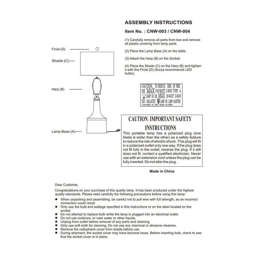 • Colors: Body: White; Shade: Tan; Finial: White; Harp: Metallic – Gold; Cord: Translucent