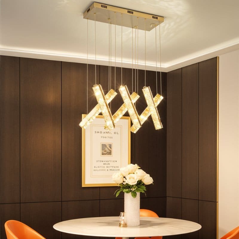 The Lucente Chandelier features a striking geometric design with crystal and iron elements, creating a modern and luxurious light fixture. Its cascading arrangement of illuminated crystal bars offers a captivating glow, making it ideal for dining rooms, living spaces, or high-ceiling areas. The chandelier’s sleek lines and premium materials enhance contemporary interiors with a statement piece. Perfect for both residential and commercial installations.