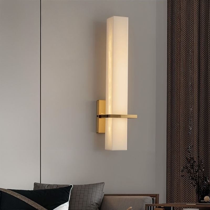 The Lunara Wall Lamp is a contemporary light fixture crafted with alabaster and brass, offering an elegant design. The cylindrical alabaster shade provides a soft, diffused glow, while the brass accents add a touch of sophistication and durability. This wall-mounted light fixture is ideal for modern interiors, including living rooms, bedrooms, hallways, enhancing any space with its minimalist aesthetic and warm illumination.