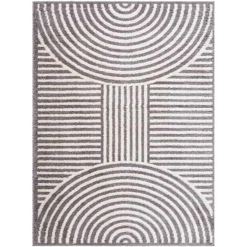 Step into effortless style and comfort with the Marcela Modern Charcoal Washable Area Rug. Designed to seamlessly blend Art Deco influences with contemporary aesthetics, this eye-catching rug features a geometric pattern of concentric circles and linear accents in a refined palette of charcoal and light beige. Machine-woven in Turkey from 100% polyester, its plush high pile offers a velvety-soft underfoot experience while ensuring lasting durability. Whether placed in a living room, bedroom, or entryway, Marcela enhances any space with its bold yet sophisticated design.