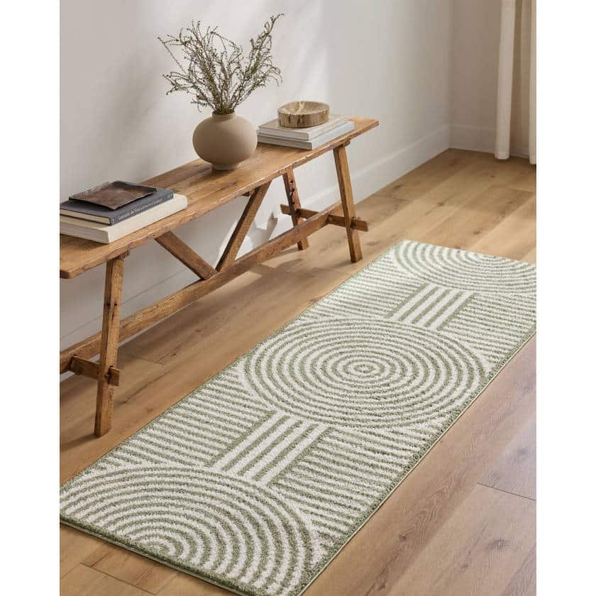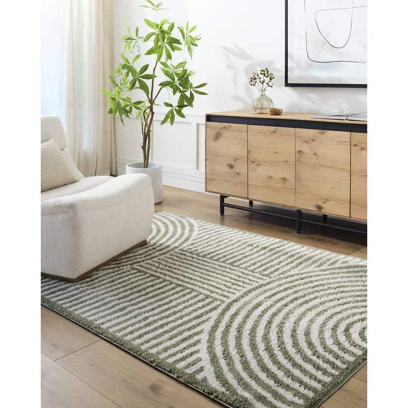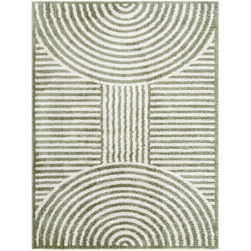 Dive into a realm of serene elegance with the Marcela Modern Grass Green Washable Area Rug. This isn’t just a rug; its a tactile experience, a whisper of Art Deco sophistication brought to life in your living space. Born from the skilled hands of Turkish artisans and meticulously machine-woven, this rug features a mesmerizing geometric pattern of concentric arches and horizontal stripes, rendered in soothing grass green and soft cream hues. Its high-pile polyester construction promises a cloud-like softness, transforming any room into a haven of comfort.