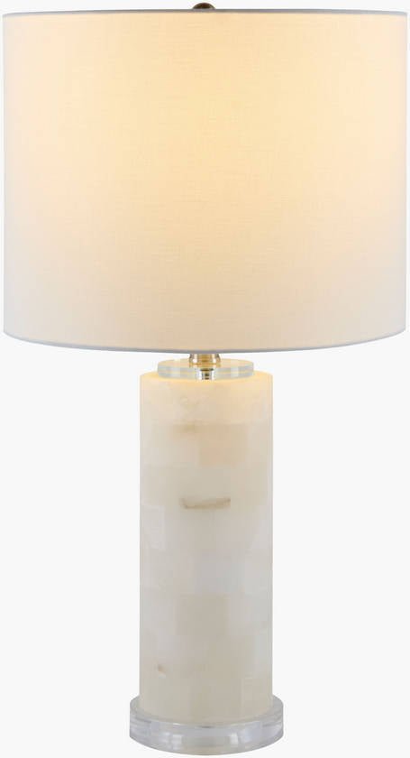 - Material: Body: Stone; Base: Acrylic; Shade (Outside): Linen; Finial: Iron