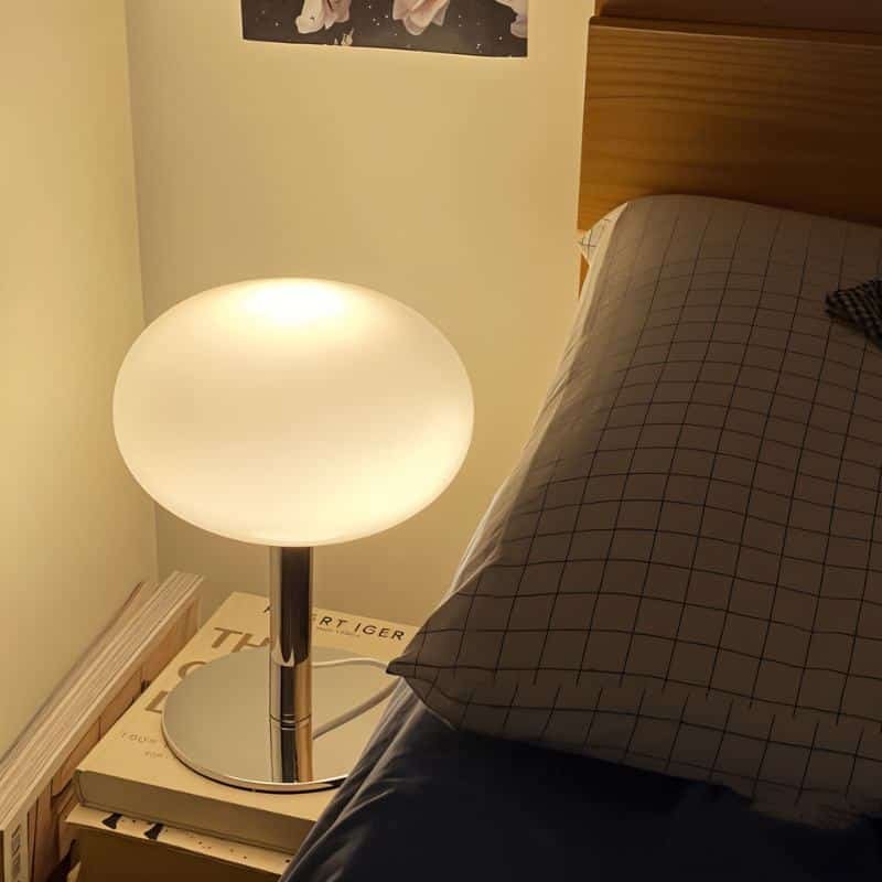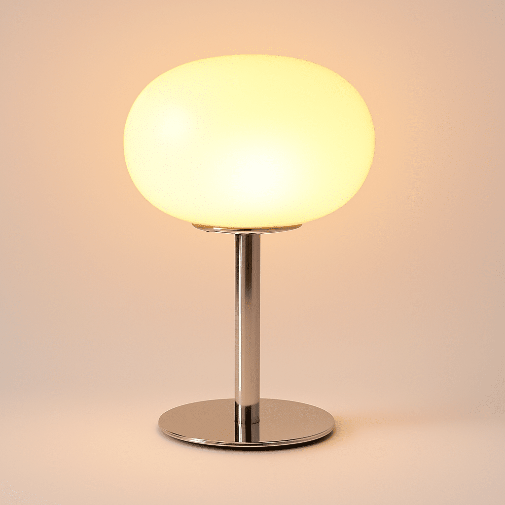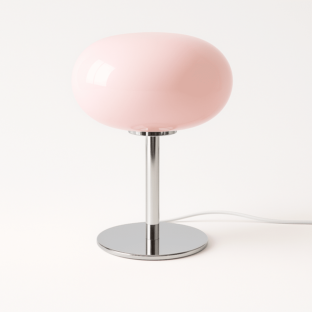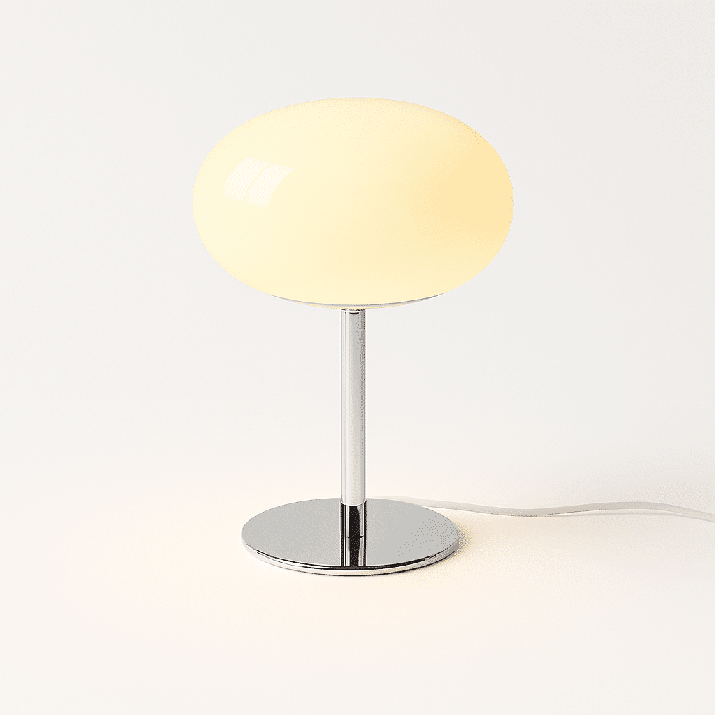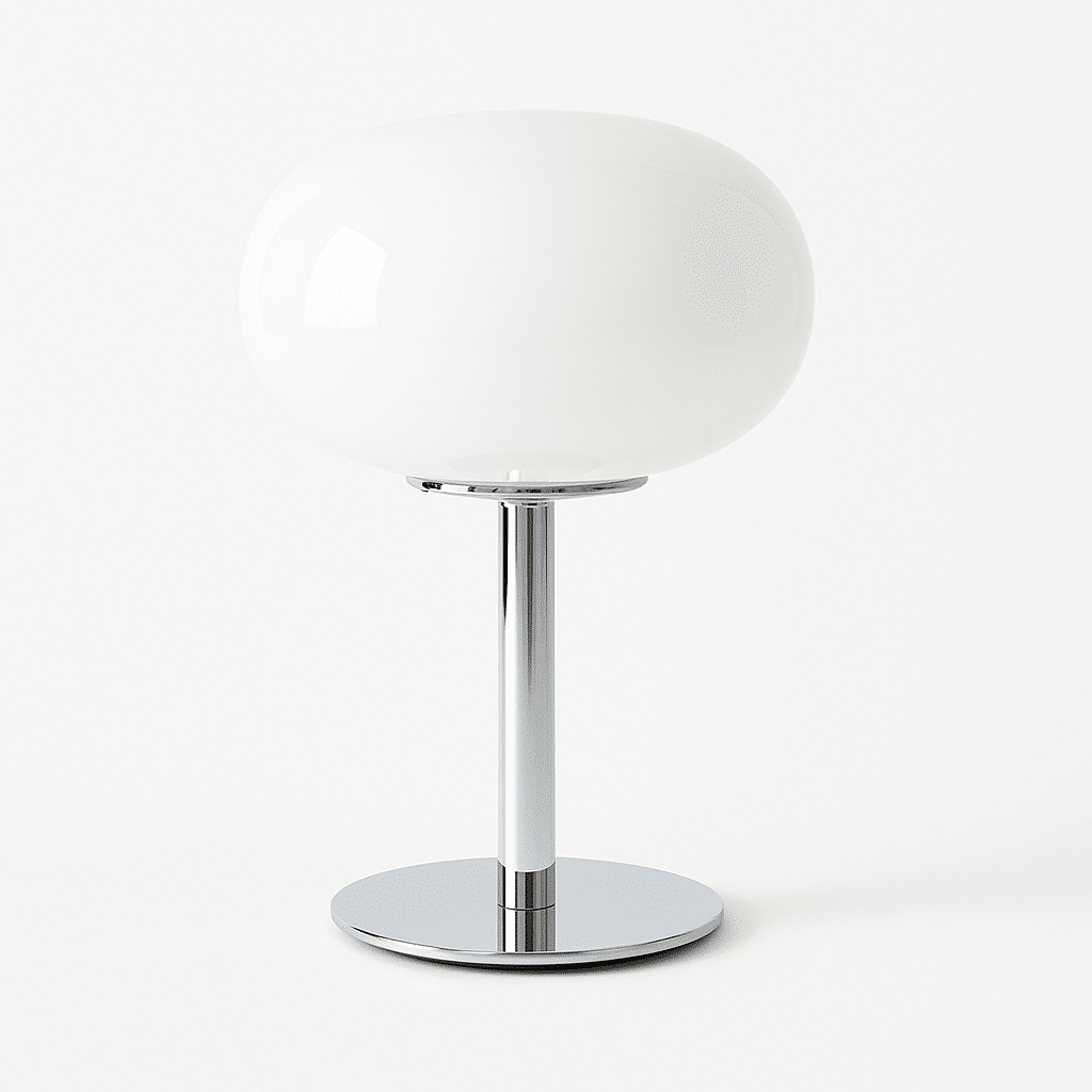 The Meliora Table Lamp features a 1970s aesthetic, with a chromed iron base and a glossy glass lampshade. Its classic retro flair, coupled with its ability to radiate and soften illumination, makes this statement piece a perfect combination of style and functionality, suitable for any desk, nightstand, or bedside table in a modern, traditional, or transitional setting.