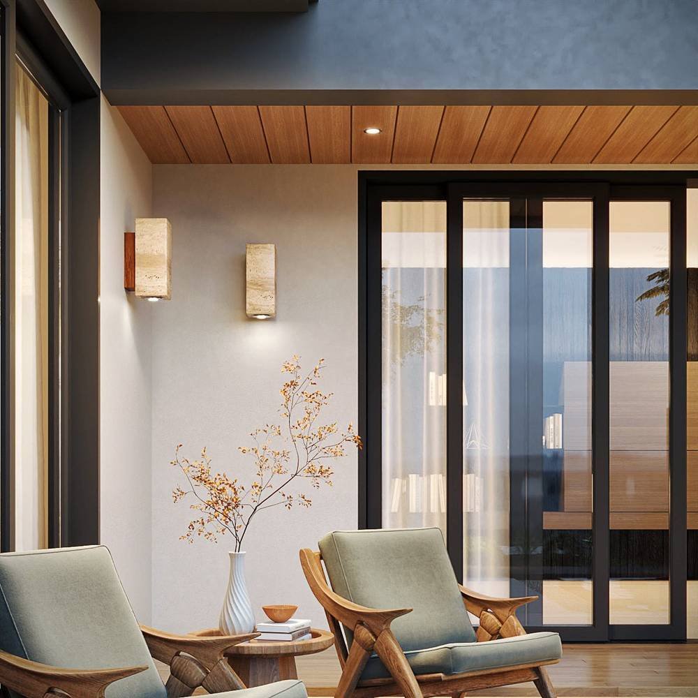 The Mireille Wall Lamp features a streamlined geometric form, unifying natural travertine and unique materials to bring elegance and refinement to your space. It provides a visually striking display of light with a warm and graceful tone, making it ideal for the dining room, living room, corridors, or above bedside tables, impressing with its graceful beauty and making any interior setting: either modern or transitional.