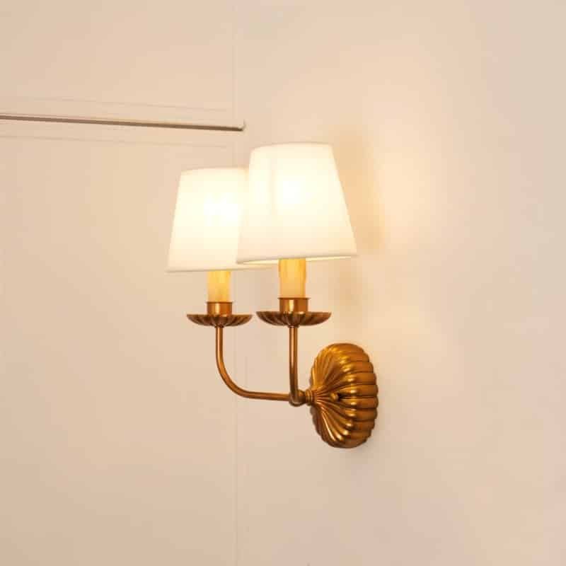 The Nagti wall lamp is an elegant vintage-inspired light fixture crafted from iron with a fabric lampshade. Its sculpted base features a fluted, gold-finished shell motif that adds a rich, classical character. The twin-arm design mimics traditional candle sconces, enhanced by faux wax-drip candle sleeves for added authenticity. Topped with sleek white fabric shades, this light fixture diffuses soft ambient light, ideal for hallways, bedrooms, living rooms, or alongside mirrors. The Nagti wall lamp merges ornamental charm with functional lighting, making it a perfect choice for traditional, eclectic, or transitional interiors.