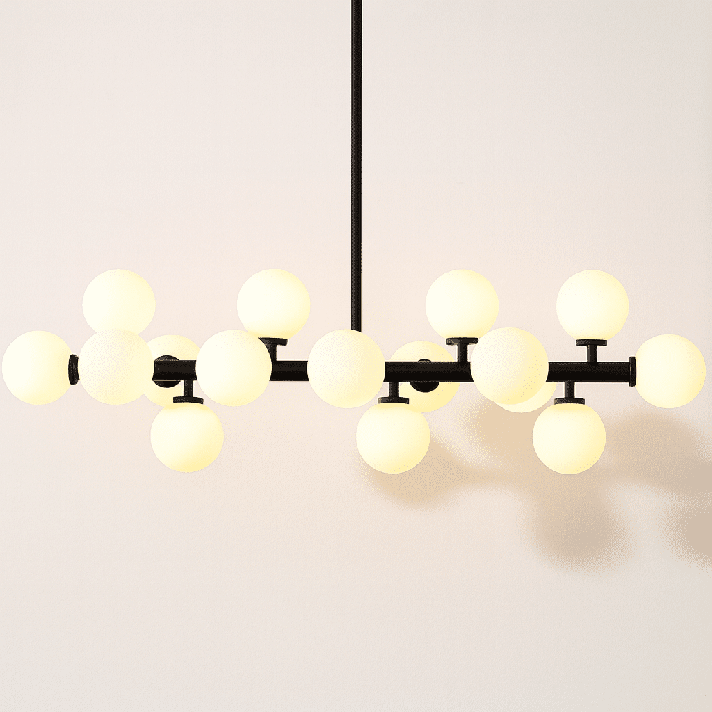 The Novira Chandelier is a statement light fixture featuring a bold metal frame with frosted glass globes, creating a sculptural balance of form and function. Available in 16 heads and two finishes, it complements modern, industrial, and mid-century interiors. Ideal for dining areas, living rooms, and loft spaces, this chandelier distributes ambient light evenly. Its geometric structure and modular design make it a striking focal point. Crafted from durable metal and glass, it ensures longevity and refined aesthetics.