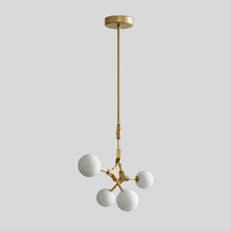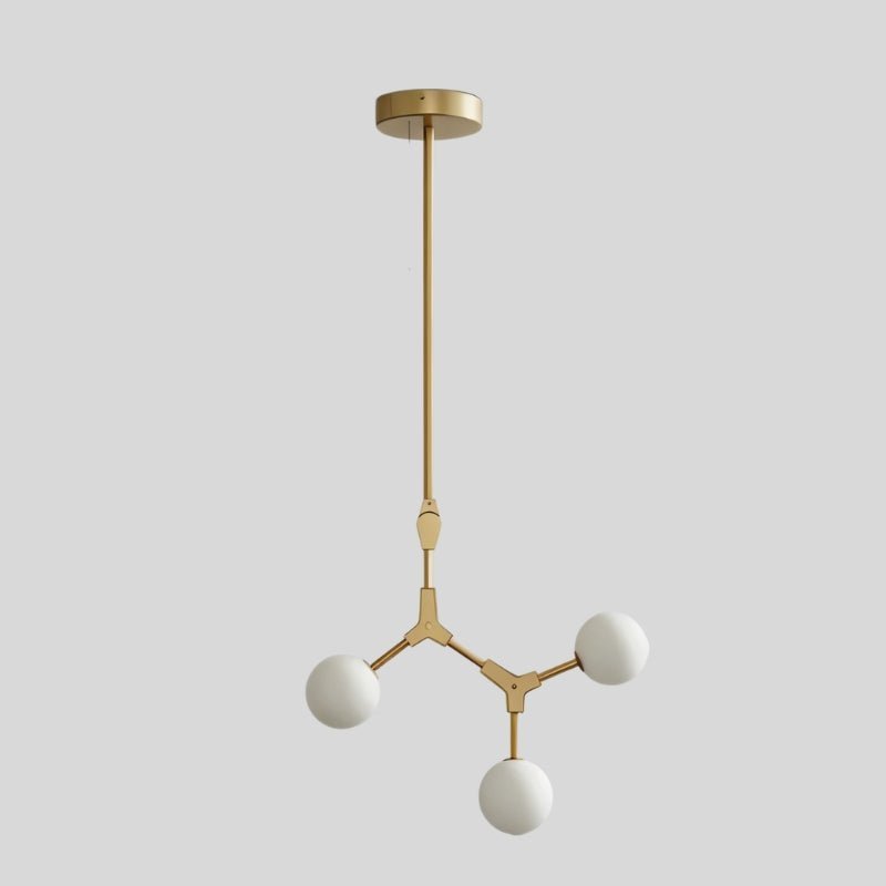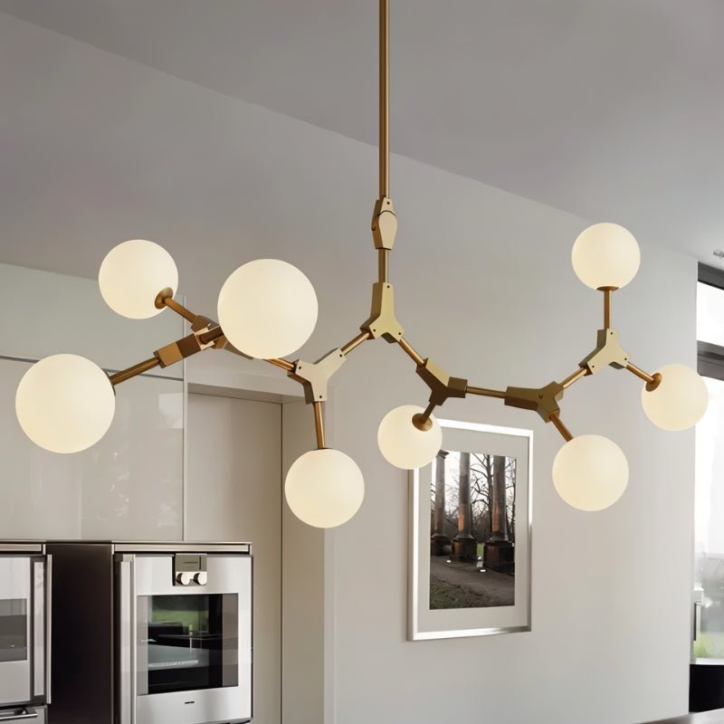 The Noxira Chandelier is a modern light fixture made from durable iron and frosted glass, featuring adjustable arms with spherical glass shades for a bold geometric look. Its sculptural design provides balanced illumination, making it ideal for kitchens, dining rooms, and open-concept spaces. This versatile light fixture enhances both residential and commercial interiors, blending functionality with contemporary elegance.