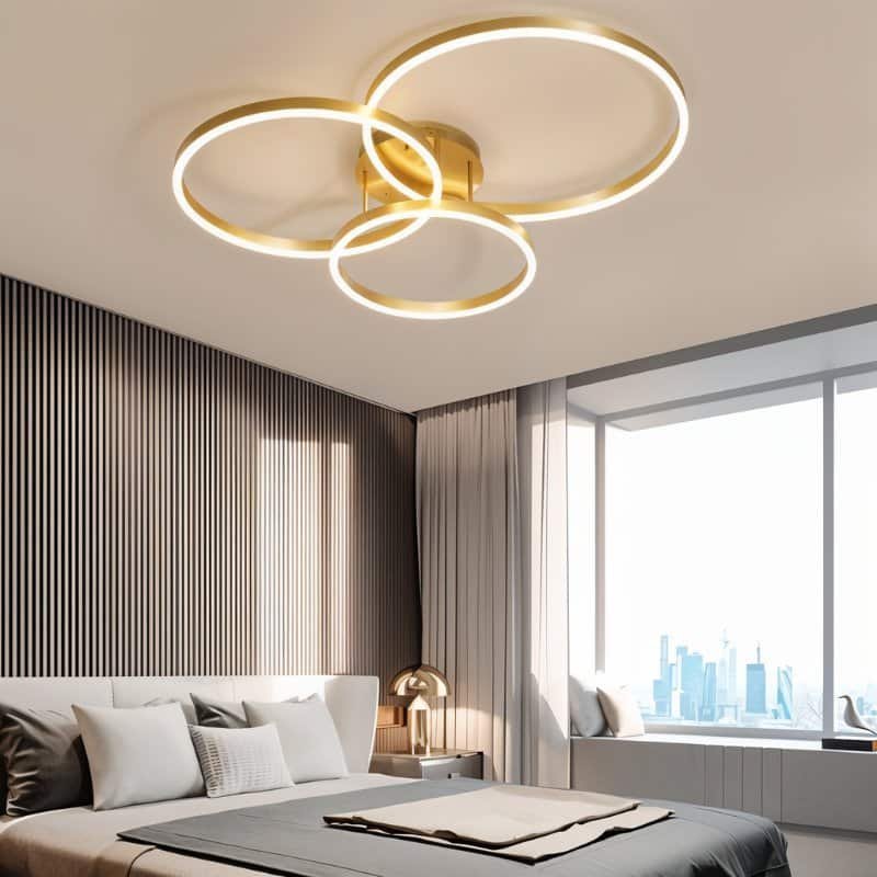 The Nuri Ceiling Light features a minimalist and geometric design with three interlocking circular frames. Crafted from iron and acrylic, this modern light fixture emits a warm, diffused glow. The Nuri Ceiling Light is ideal for contemporary bedrooms, living rooms, or dining spaces, adding a touch of sophistication and a unique focal point to your interior.