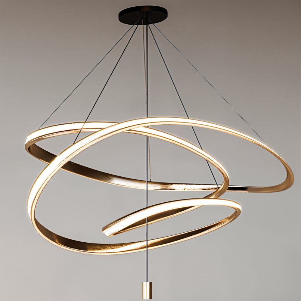 Any room will be enhanced by the gorgeous Olenna Chandelier. It has a classic gold finish on its aluminum body with an abstract spiral effect. The shiny appearance is enhanced by the acrylic diffuser, which emits gentle, glare-free lighting. In contrast to traditional lights that sit flush against the ceiling and evenly light a room, it makes a lovely replacement for conventional lanterns and offers a stylish and chic way to brighten up an entire room or direct light to a specific region, or highlight within a space.