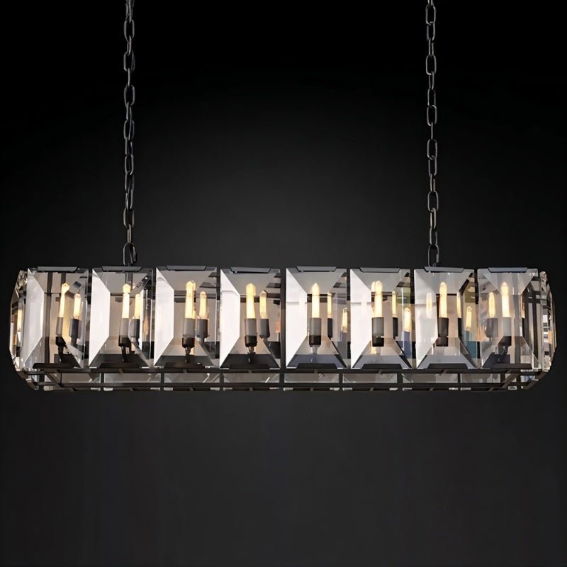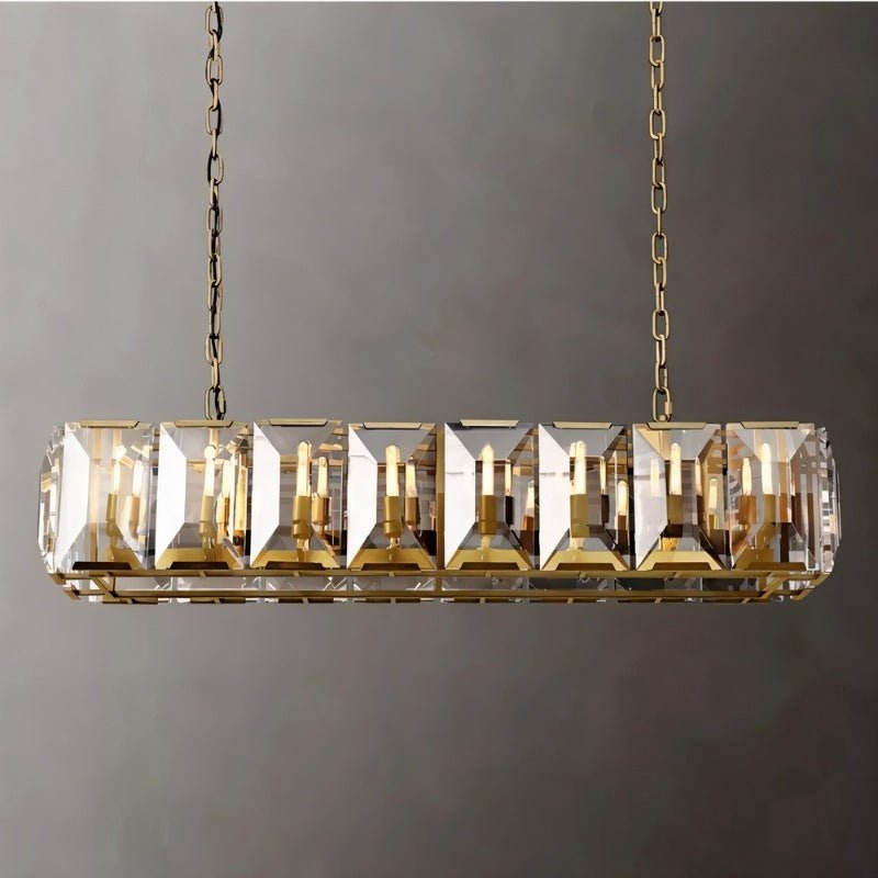 Our Chandelier is inspired by 1970s German chandeliers, capturing their boldness and glamour. Crafted with faceted crystal glass prisms in a circular design, they brilliantly reflect and refract light, resembling the sparkle of an emerald-cut diamond.