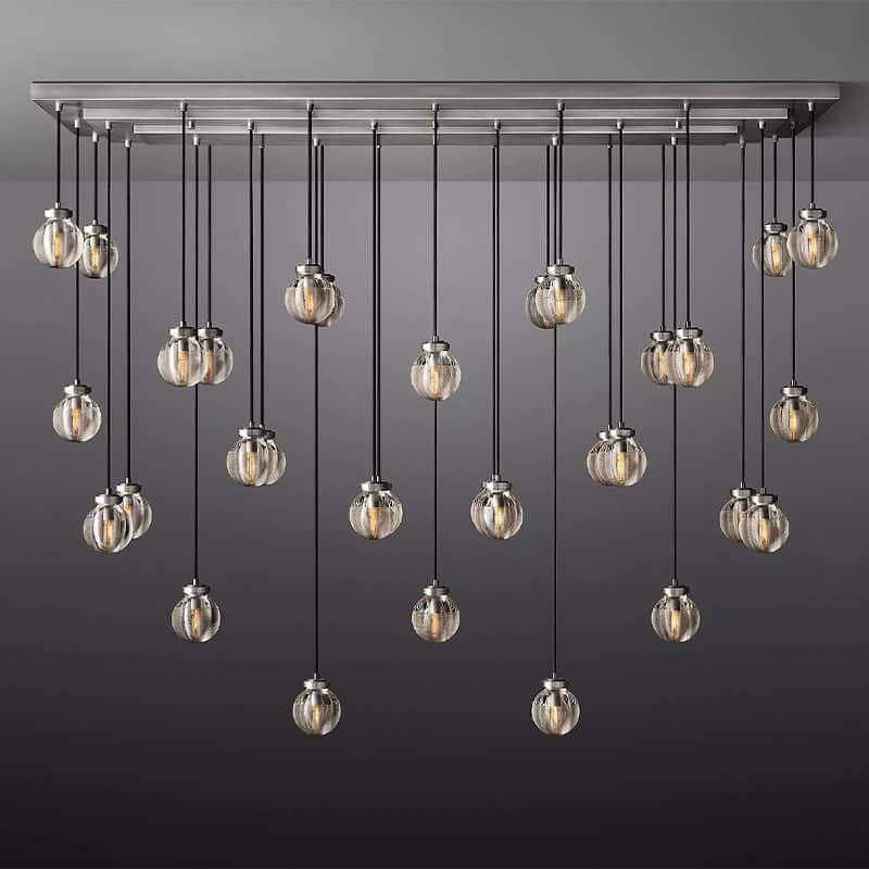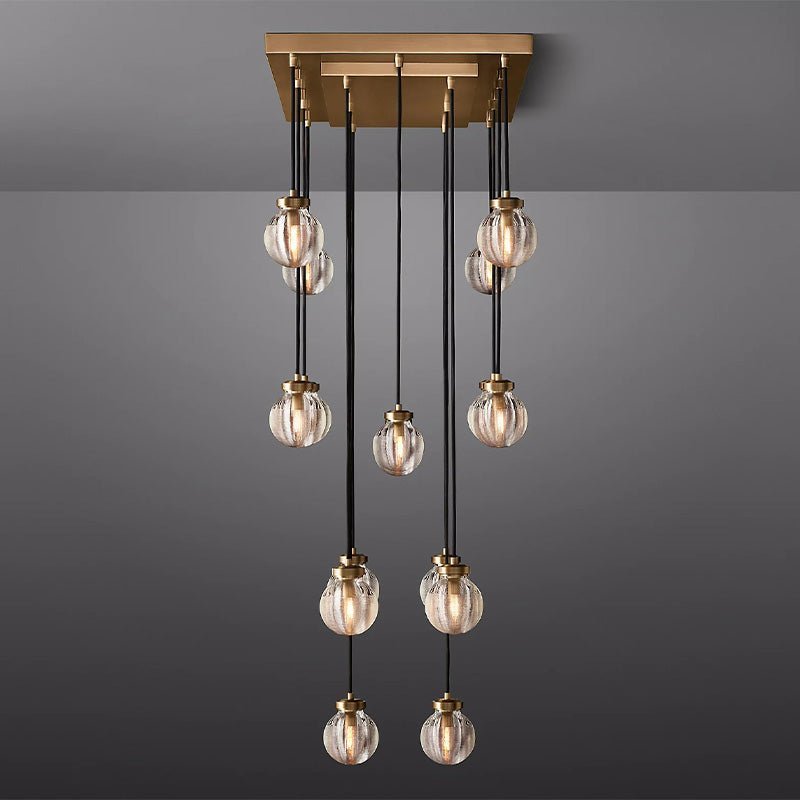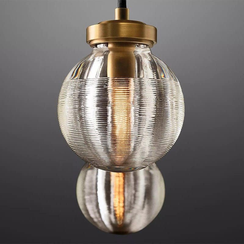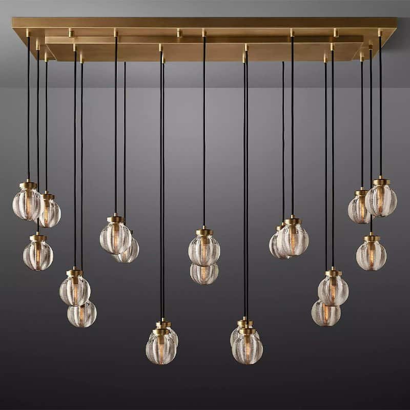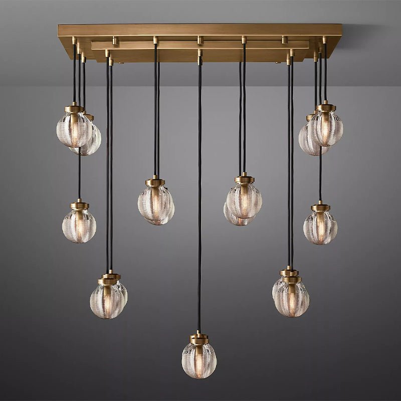 This glass and brass chandelier is inspired by pearls. Delicately carved grooves in the glass emit radiant layers of shimmering light, giving your space an ethereal and intimate feel.