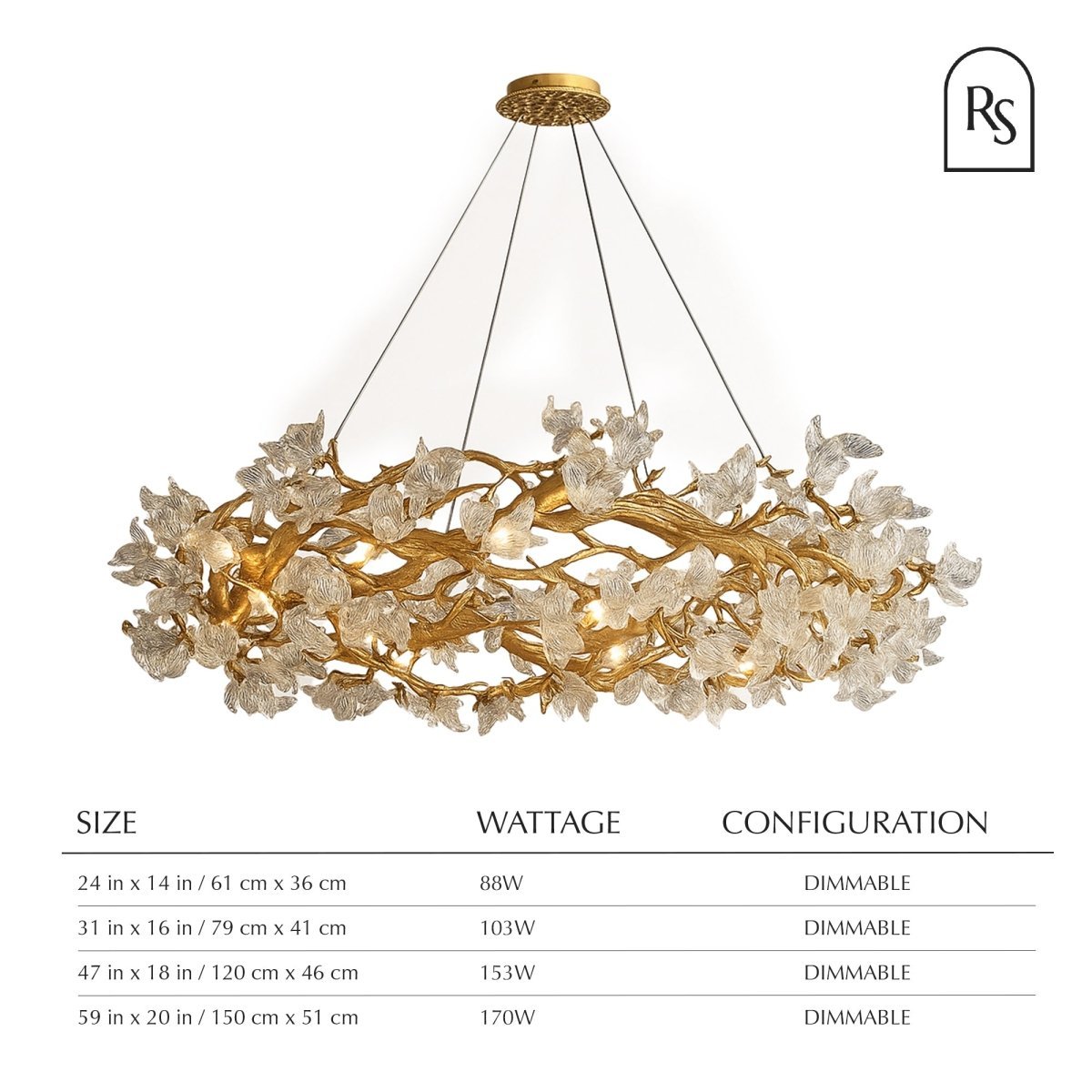 This brass chandelier features a design inspired by split petal shapes, combining luxury with technology and nature. Its intricate body, adorned with delicate crystal petals, creates a unique blend of lighting and natural beauty, making each piece a special work of art. This stunning chandelier would be a dramatic centerpiece for a large living room, dining room, or entryway.