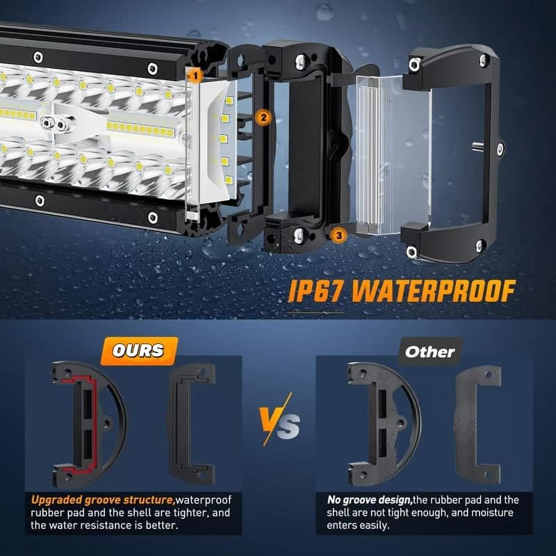 PREMIUM DURABILITY & WATERPROOF: Built with an aluminum alloy shell and IP67-rated protection, this light bar withstands extreme weather (-40°C to 80°C) and resists dust, rain, and shocks. Ideal for rugged use on trucks, SUVs, or construction vehicles.