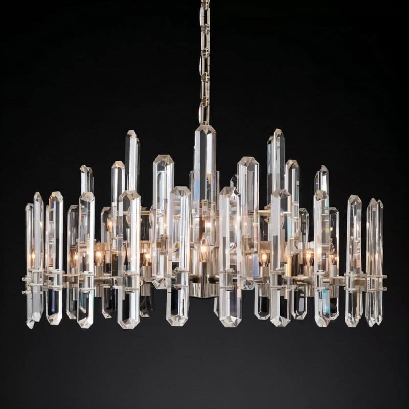 The Prizma Round Chandelier is a modern masterpiece, featuring a dramatic arrangement of crystal rods and a sleek stainless steel frame. It casts a captivating glow, adding a touch of glamour to dining rooms, living rooms, and foyers.