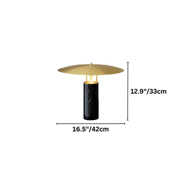 - Unique cylindrical base and disc shade create a sculptural, modern light fixture.