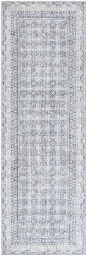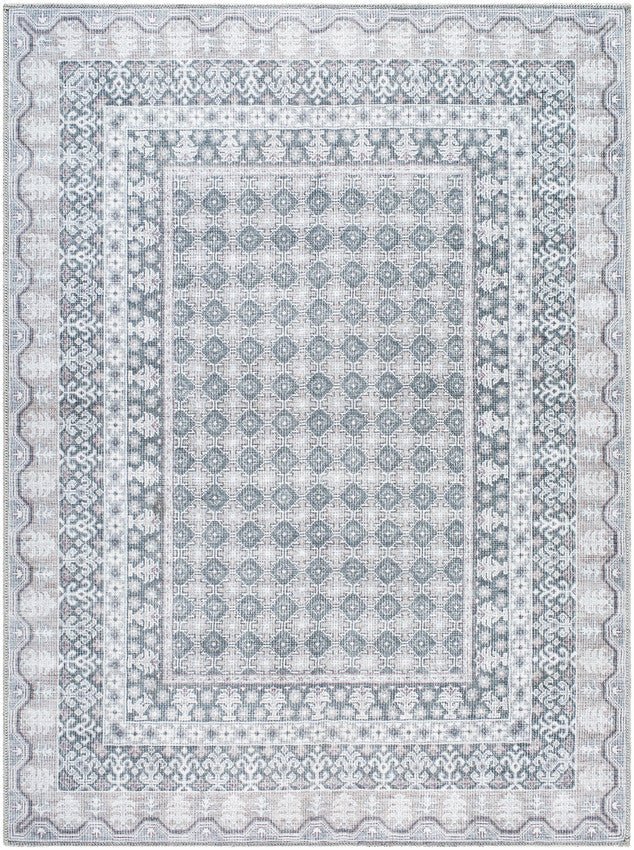 Embrace the inviting comfort of country living with the Rainier Cottage Pale Blue Washable Area Ruga charming foundation for any room in your home. This Turkish-made beauty brings delicate pale blue tones together with soft sage, tan, and off-white in an elegant, timeworn design that complements both rustic and refined interiors. Crafted from 100% durable polyester, this machine-woven rug offers a perfect balance of classic style and modern practicality.