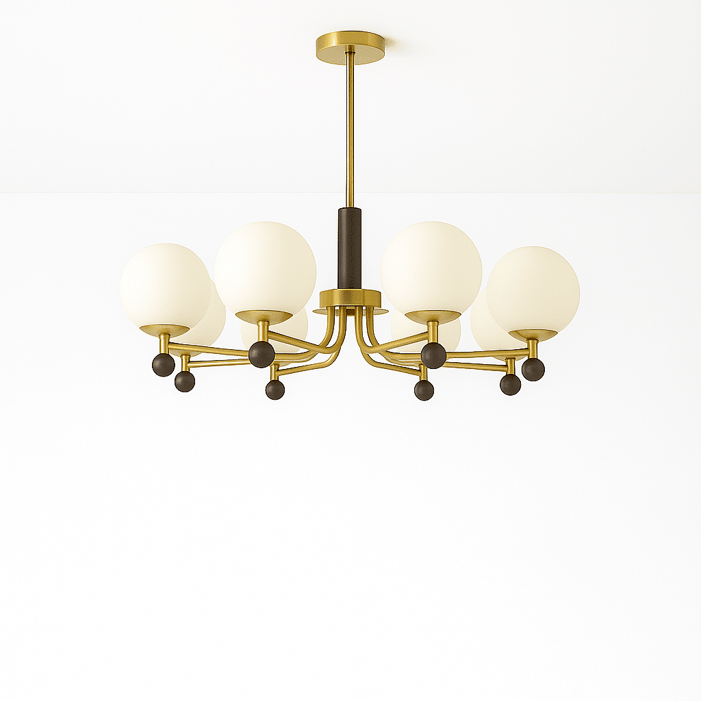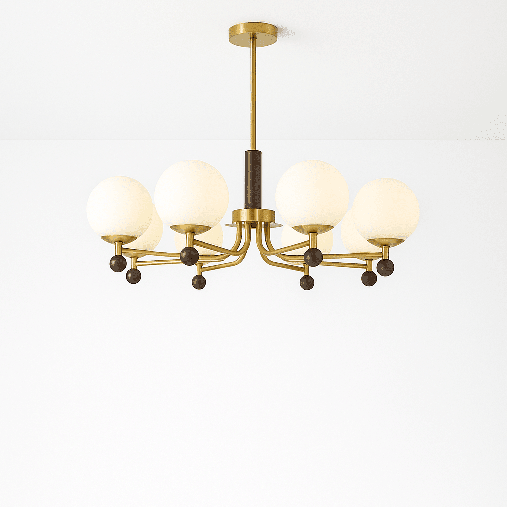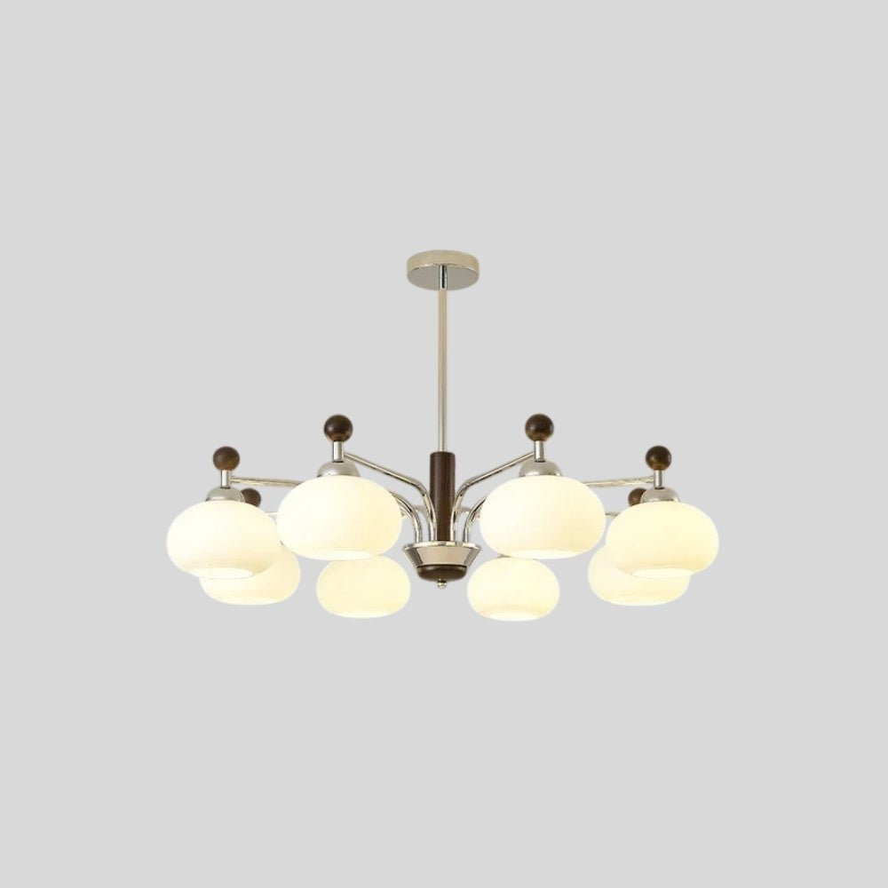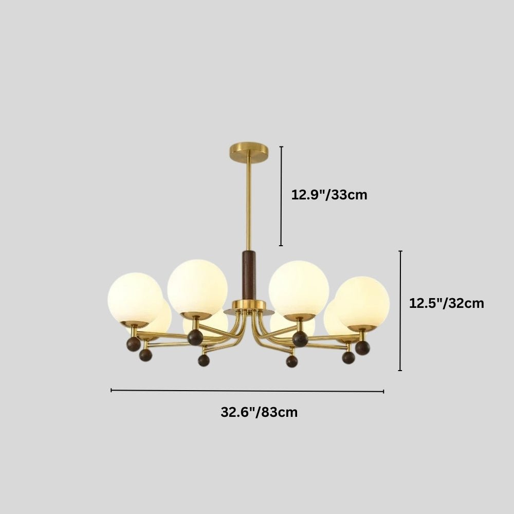 The Ralie chandelier features a striking blend of iron, wood, and glass, creating a sophisticated light fixture. Its curved arms extend gracefully, supporting frosted glass globes that diffuse light evenly. The combination of warm wood accents and sleek iron structure adds elegance, making it ideal for dining rooms, living spaces, or bedrooms.