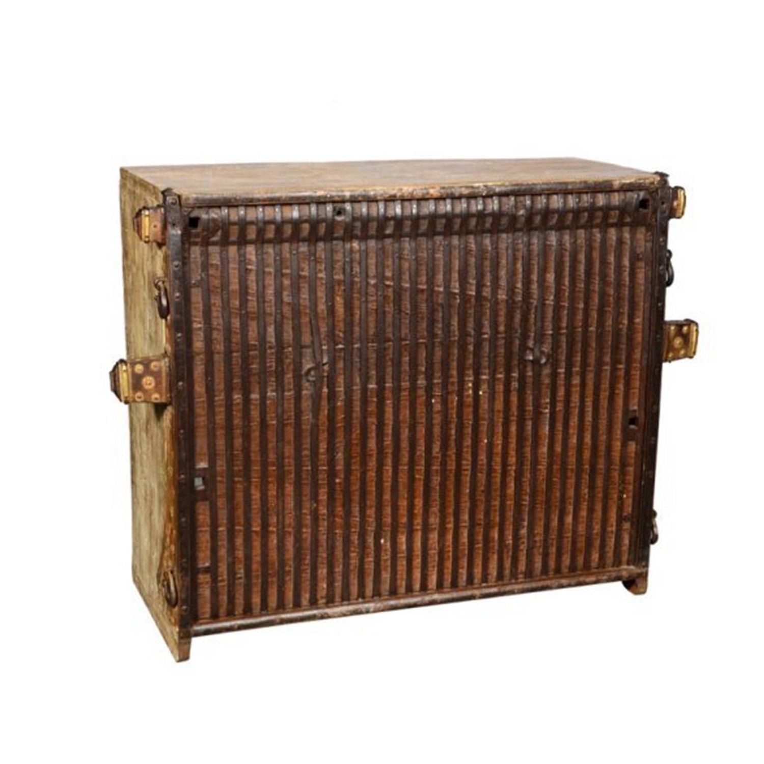 Salvaged bed of an Ox Cart has been thoughtfully designed and repurposed into this very unique Bar. The aged wood and the metal starp work of the original bed makes this a perfect addition to a country or ranch style home.