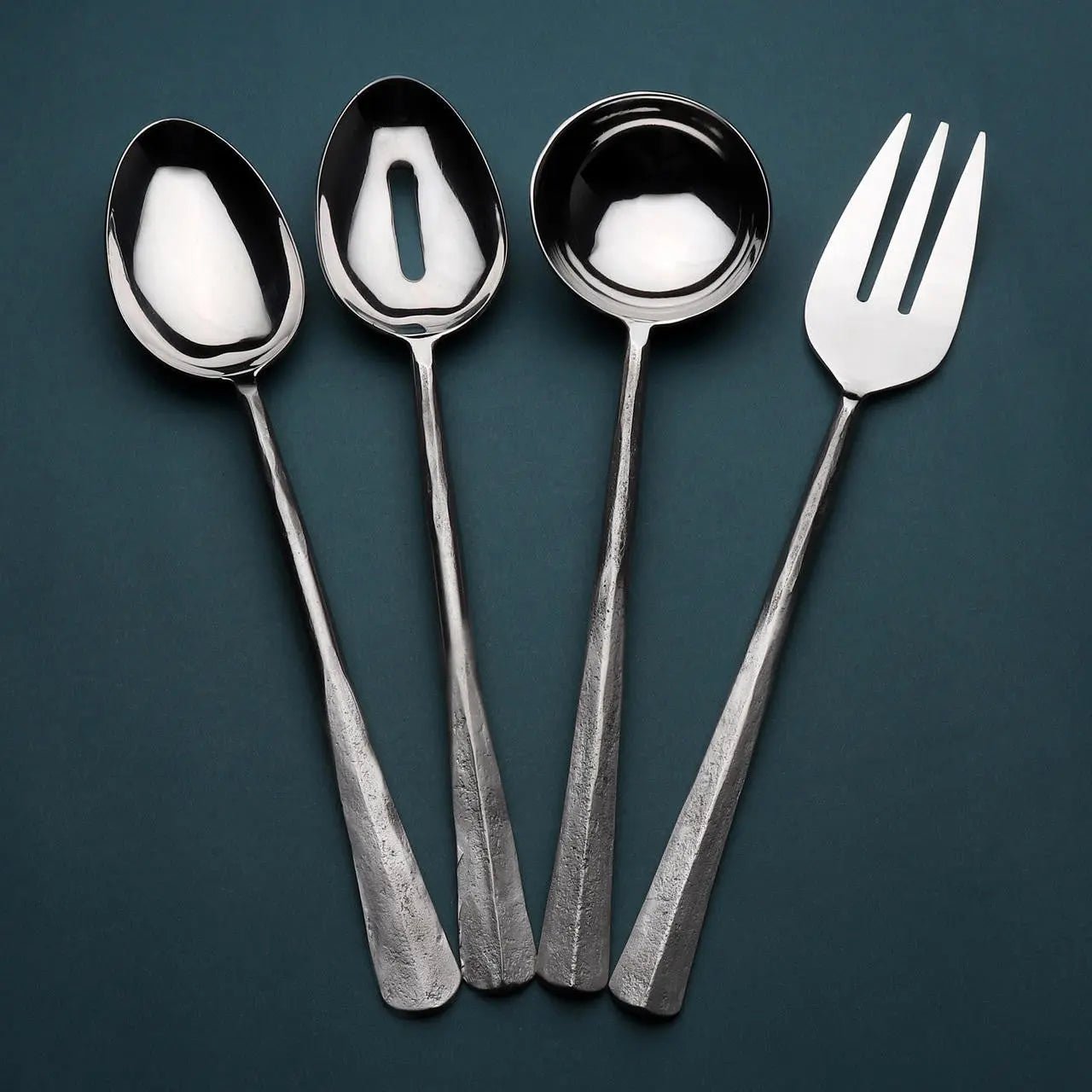 The Ridge Hostess Serving 4 Pc. Set brings a rustic, yet refined look to your table. Made for a lifetime of use, this set showcases hand-hammered ridged handles. Perfectly balanced for performance, the Ridge will complement any tablescape.