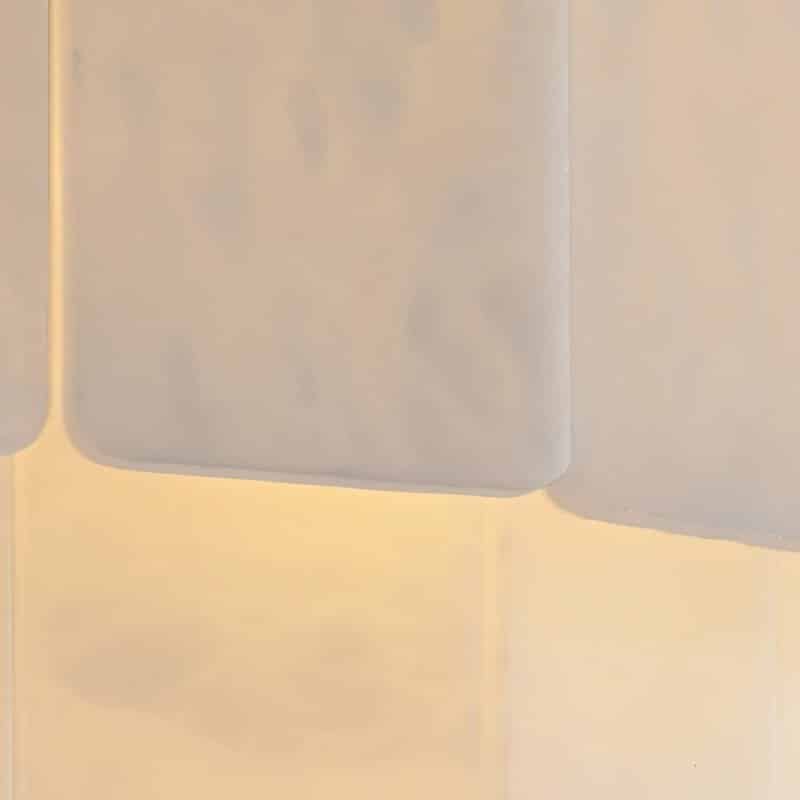 The Rigal wall lamp is a statement light fixture crafted from copper and marble, combining classic elegance with modern sophistication. Its layered marble panels diffuse light beautifully, creating a soft, ambient glow that enhances any space. The structured design, secured with subtle metal accents, adds architectural depth to walls while complementing upscale interiors. Ideal for living rooms, hallways, and luxurious settings, this wall lamp elevates contemporary and classic décor with its sculptural presence and warm illumination.