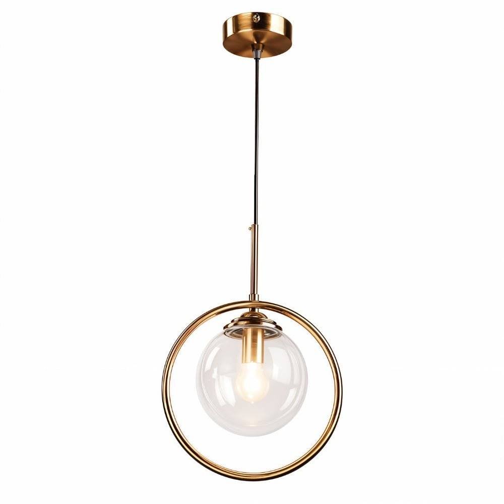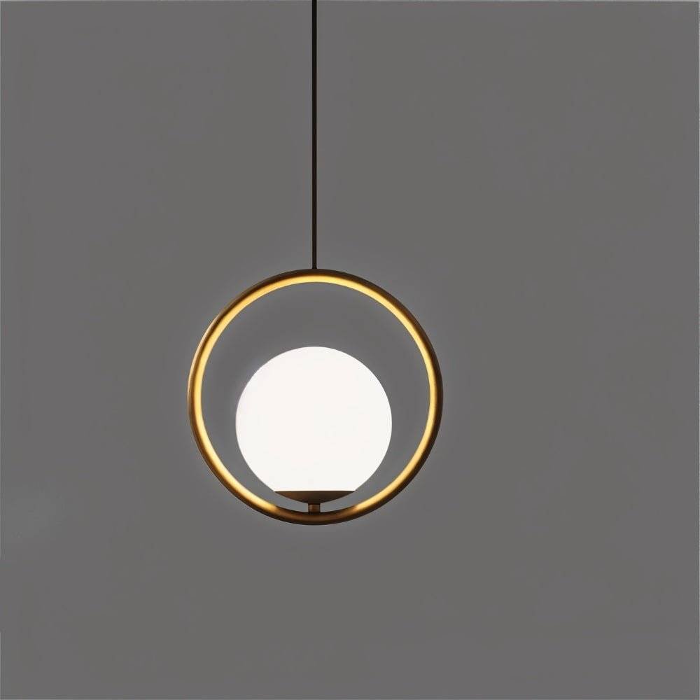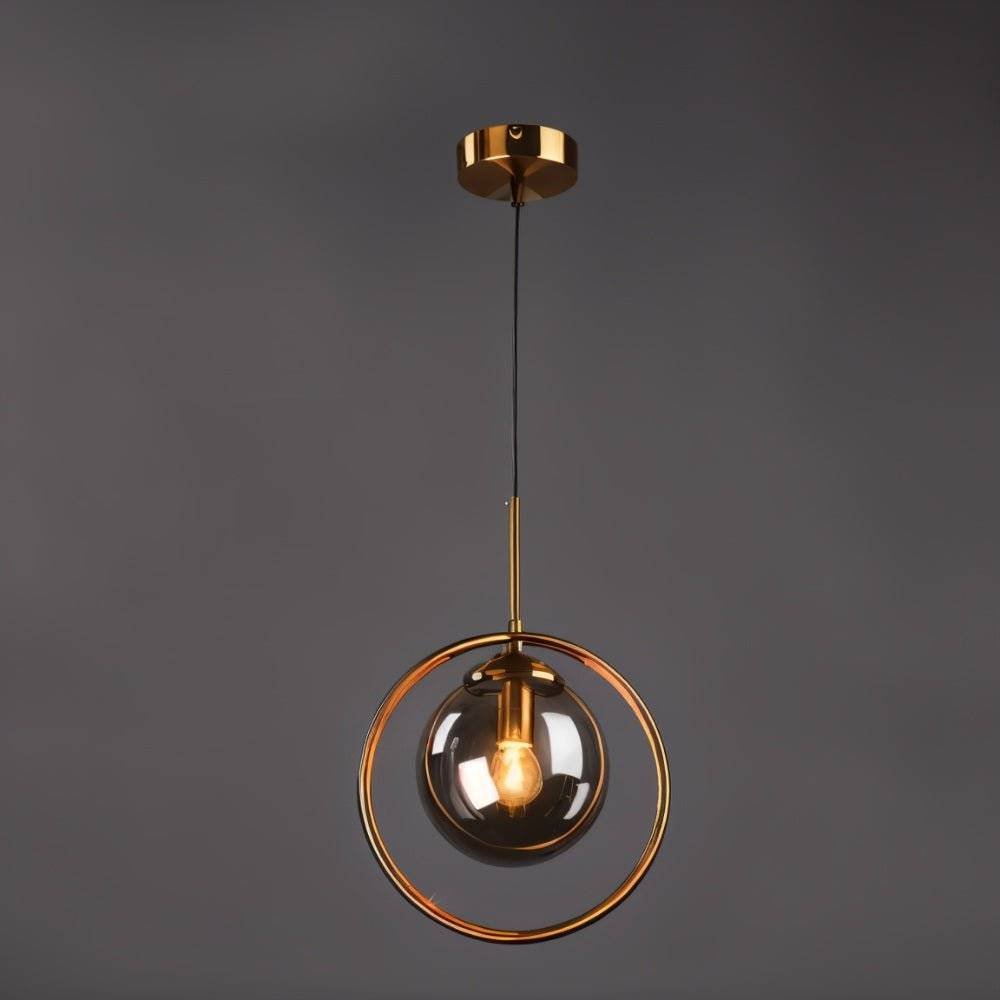 The Ring Pendant Light features a captivating design with a clear glass globe suspended within a sleek gold metal ring. This modern light fixture creates a warm and inviting atmosphere, perfect for illuminating dining rooms, kitchens, and living spaces. Its unique design adds a touch of sophistication to any contemporary interior
