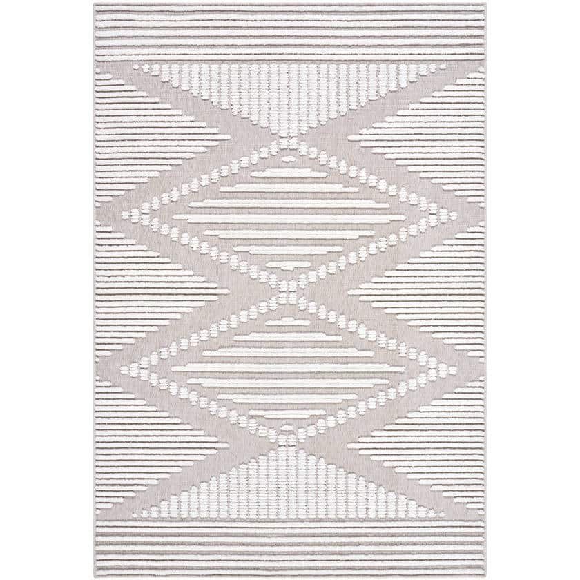The Rosamond Global Beige Washable Area Rugs striking diamond motif, textured with raised cream lines against a warm beige base, speaks to modern bohemian aesthetics. It adds subtle visual interest while keeping the palette light and neutralperfect for anchoring a minimalist living room, calming a nursery, or softening the floor of a creative studio. Its geometric design creates structure, while the soft hues make it easy to layer with any decor.