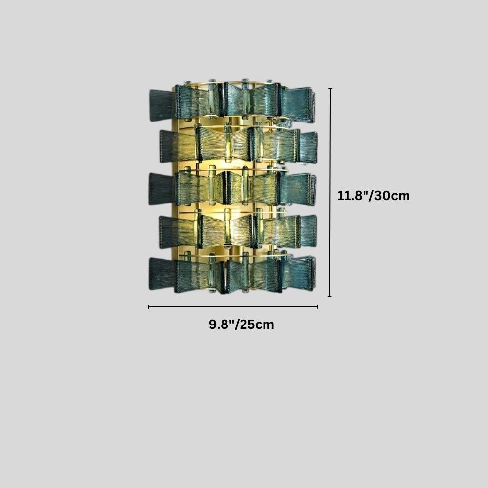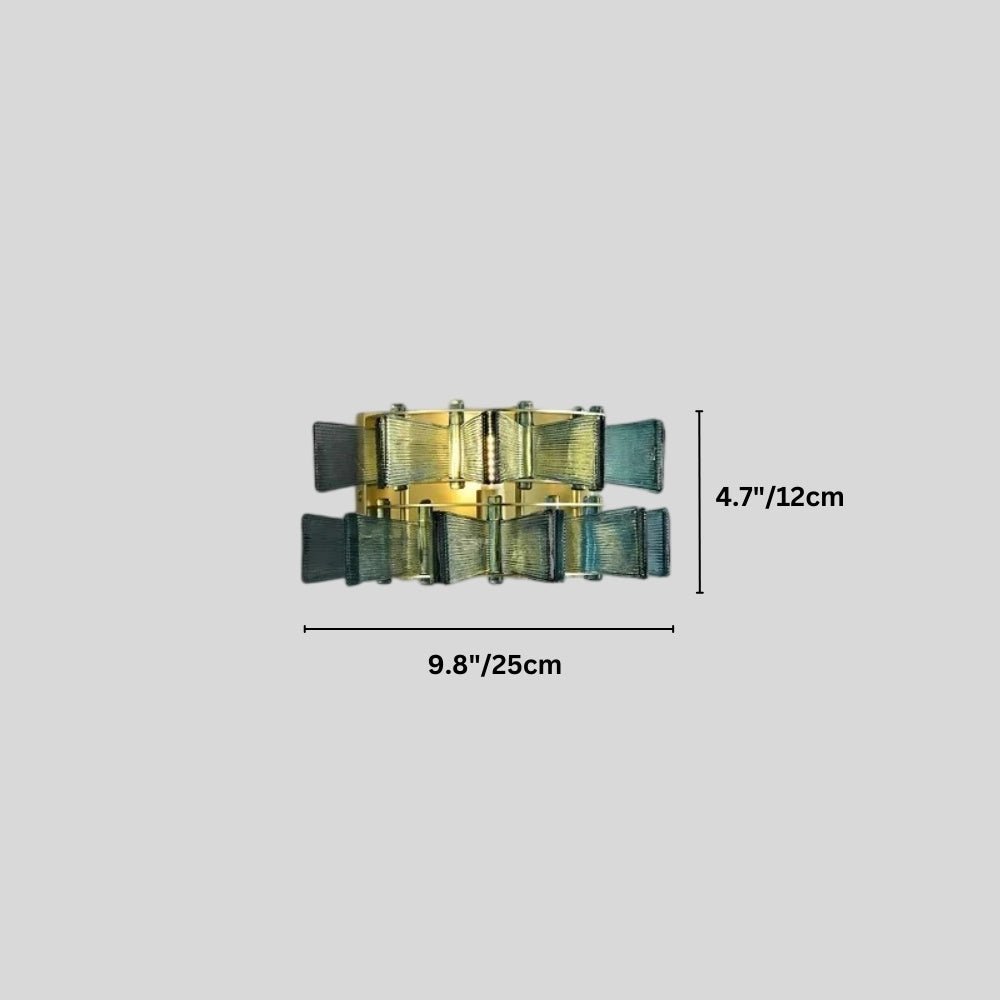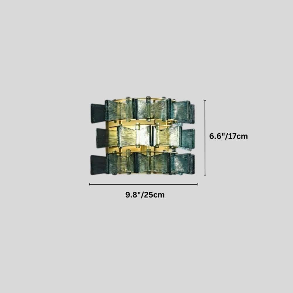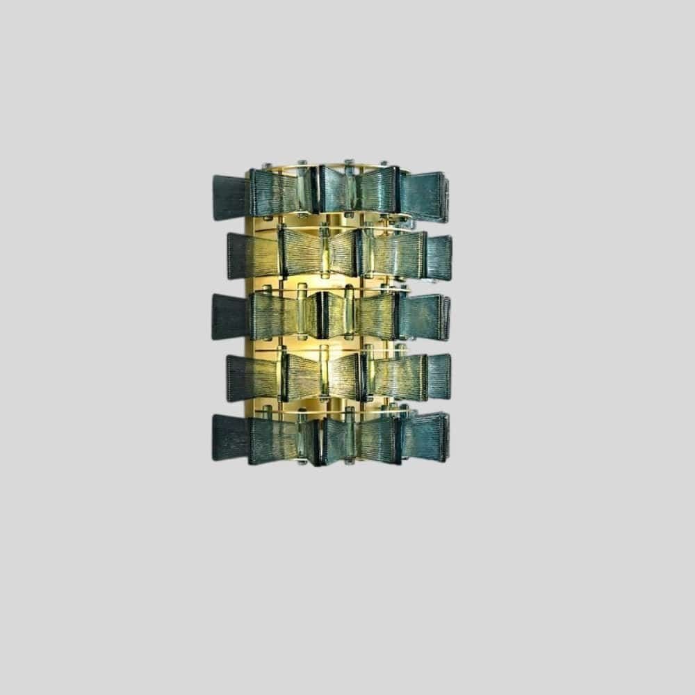 The Salane wall lamp features an intricate iron frame with layered glass panels, creating a sculptural light fixture. The textured glass diffuses light beautifully, casting a warm, ambient glow. Ideal for bedrooms, hallways, or living spaces, this striking design adds depth and elegance to contemporary and modern interiors.