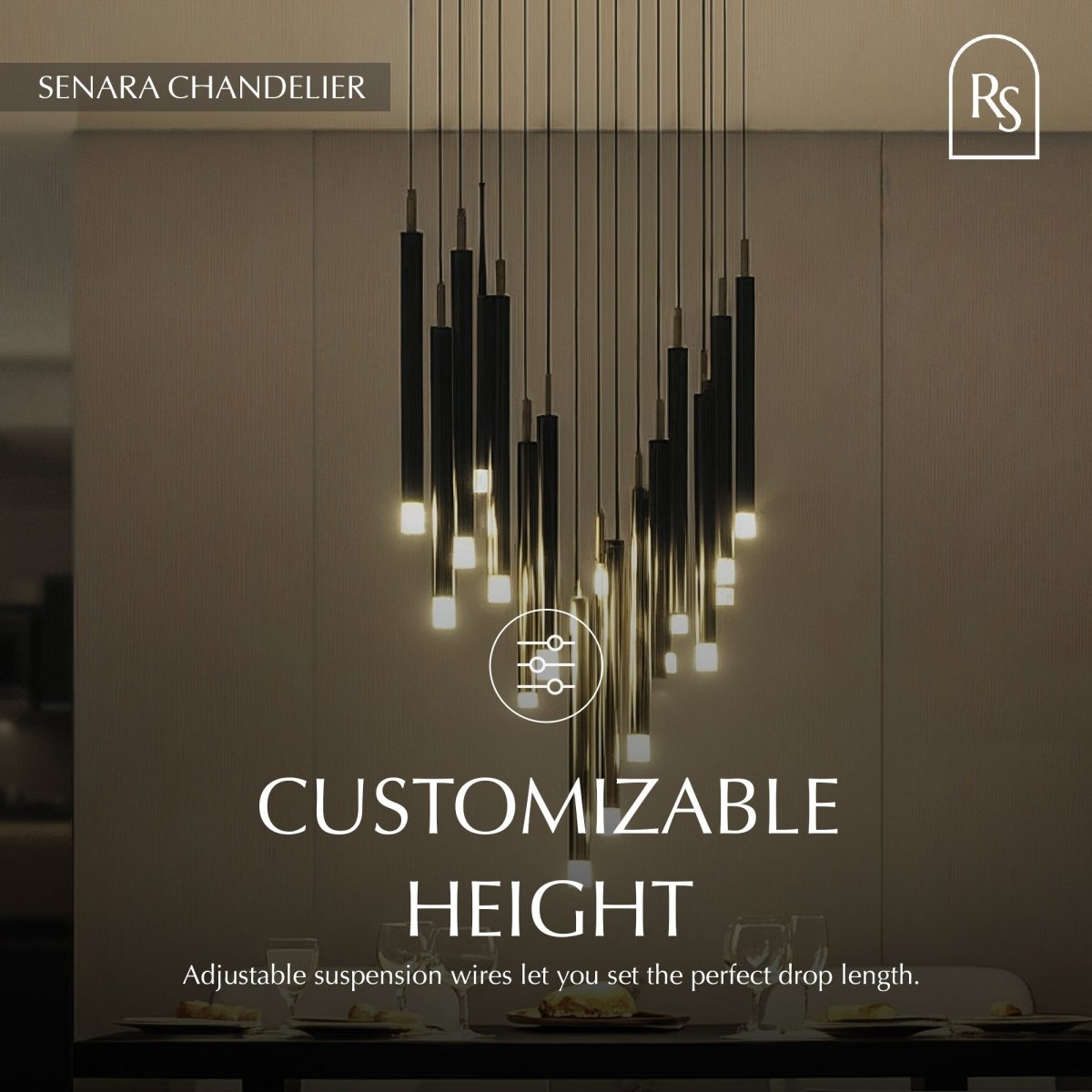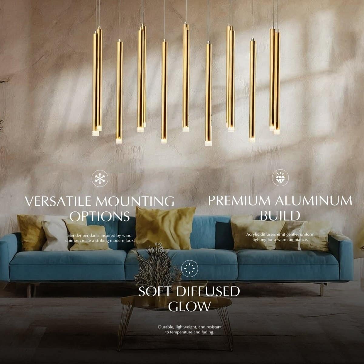 The Senara Chandelier’s top-notch aluminum construction in a sleek black or gold finish offers a crisp modern aesthetic. Inspired by the enduring formation of wind chimes, this piece comprises slender tube pendants with an acrylic diffuser that lets gentle light pass through, giving the piece a unified and sumptuous appearance. The Senara has an appealing, minimalist, and contemporary style that will complement any space in your home, whether it be the living room, dining room, or bedroom.