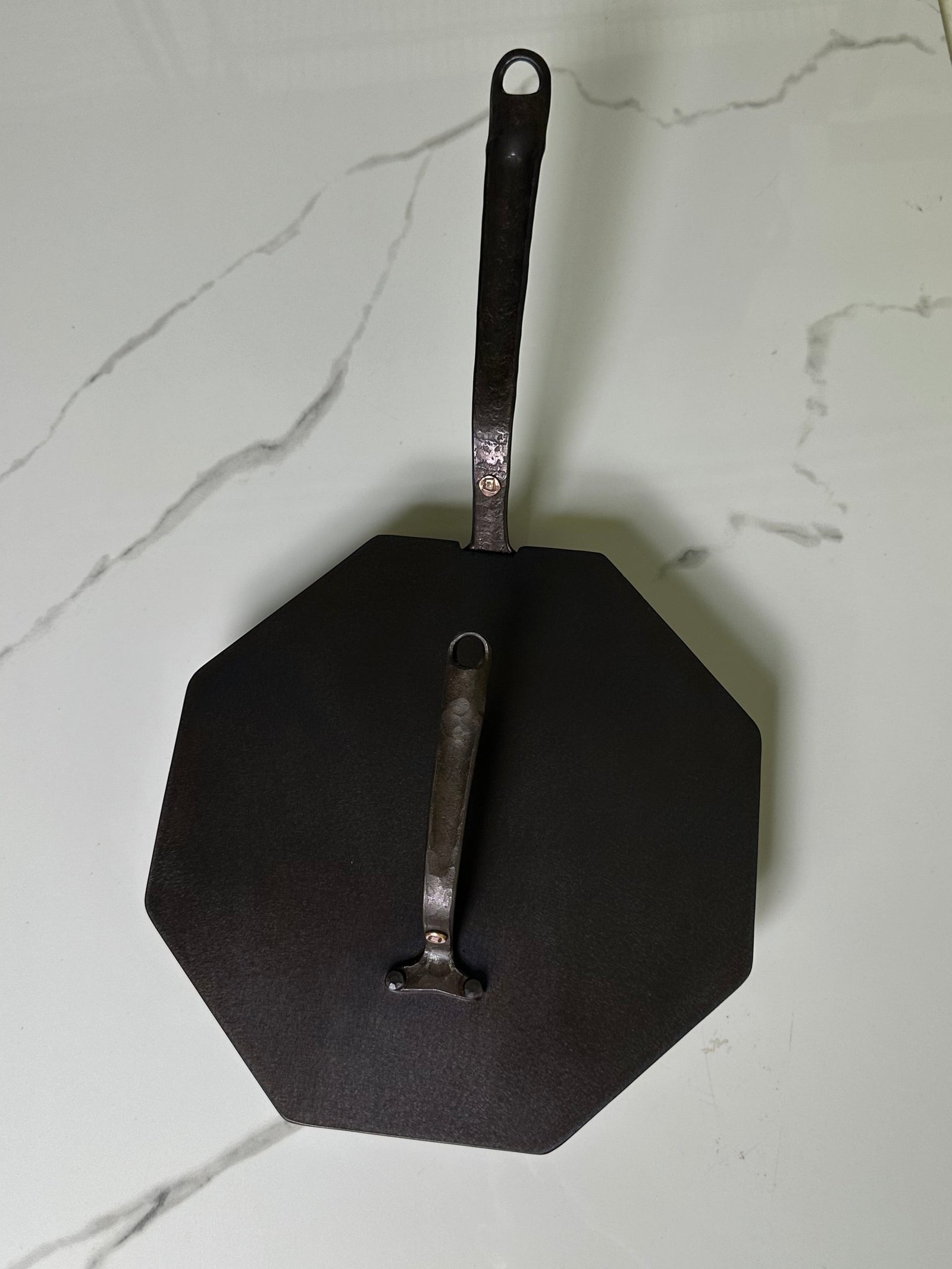Our carbon steel lids are cut to match the shape of your Copper State Forge skillet with a small overhang to account for hand forged variability. We forge a smaller version of our skillet handle that matches the style of the skillet, and attach it with two steel rivets so it matches your skillet style. It is perfect for creating a convection within your skillet. Your lid will be pre-seasoned and ready to use.