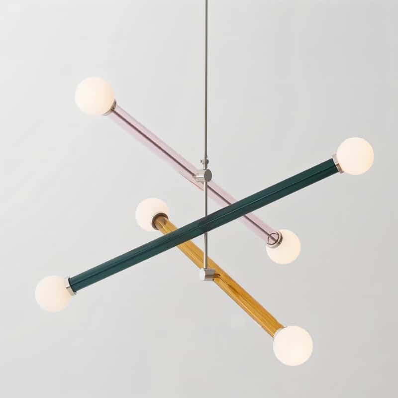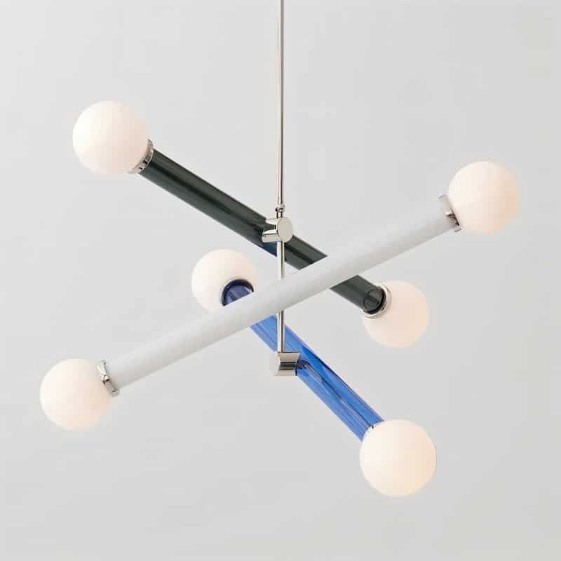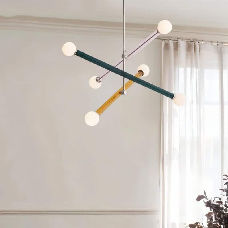 The Solaris Pendant Light is a geometric light fixture with intersecting iron rods in varied finishes, creating a bold, asymmetric design. Frosted glass globe shades provide a soft, ambient glow, balancing its modern structure. Perfect for dining rooms, living spaces, and entryways, it enhances contemporary and eclectic interiors. The mix of metal and glass adds a sleek, dynamic focal point to any space.