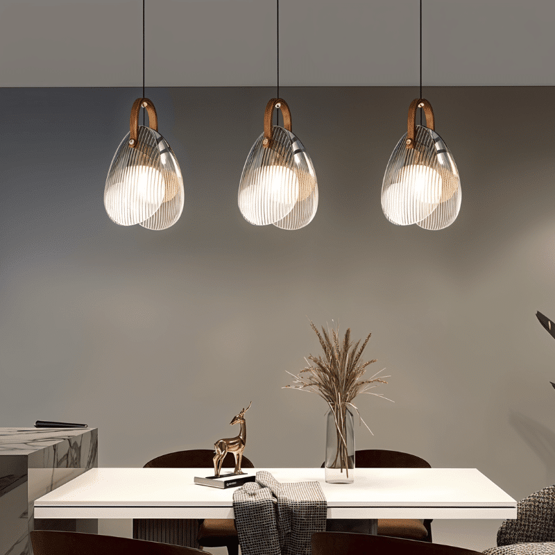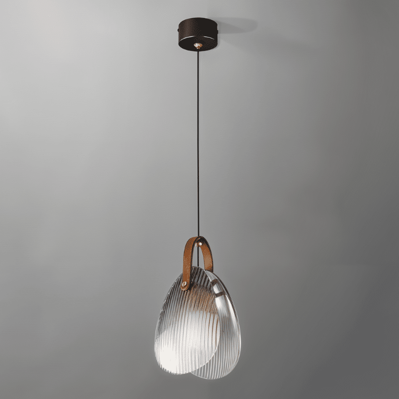 The Solya Pendant Light features a sculptural trio or single arrangement of fluted glass lampshades suspended from a sleek iron canopy. Each teardrop-shaped shade is crafted with vertical ribbing that diffuses light beautifully, while a leather-accented loop adds a refined industrial detail. This modern light fixture is ideal for dining areas, entryways, or stairwells, where layered lighting enhances architectural appeal. Offered in both 1-head and 3-head options, it adapts well to solo or clustered installations. The blend of iron and glass creates a sophisticated yet functional design centerpiece.