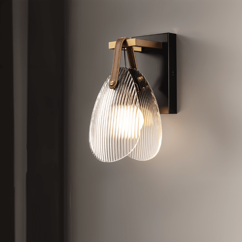 The Solya Wall Lamp is a modern light fixture that combines elegance with industrial charm. Crafted from iron and ribbed glass, its dual-leaf-shaped shade is suspended by a leather strap accent, offering a refined, sculptural aesthetic. The black and brass wall mount provides a bold contrast, enhancing its visual appeal. Ideal for hallways, bedrooms, or accent walls, this fixture delivers both ambient and decorative lighting. Its vertical, compact design makes it perfect for sophisticated, space-conscious interiors.