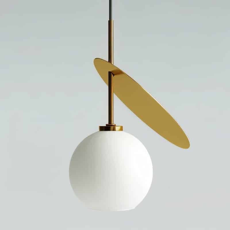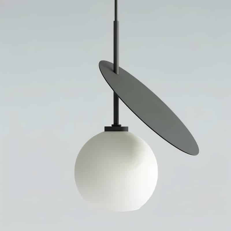- Modern geometric light fixture with spherical body and angled metal disc design.