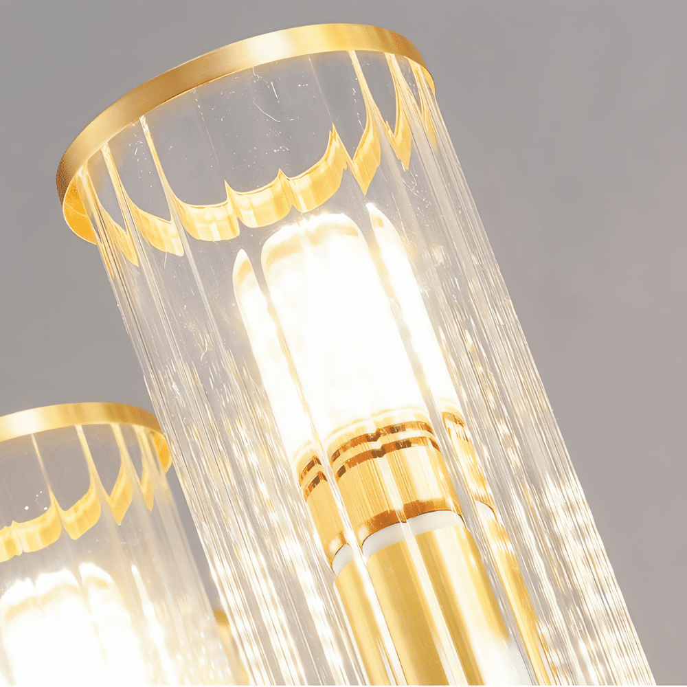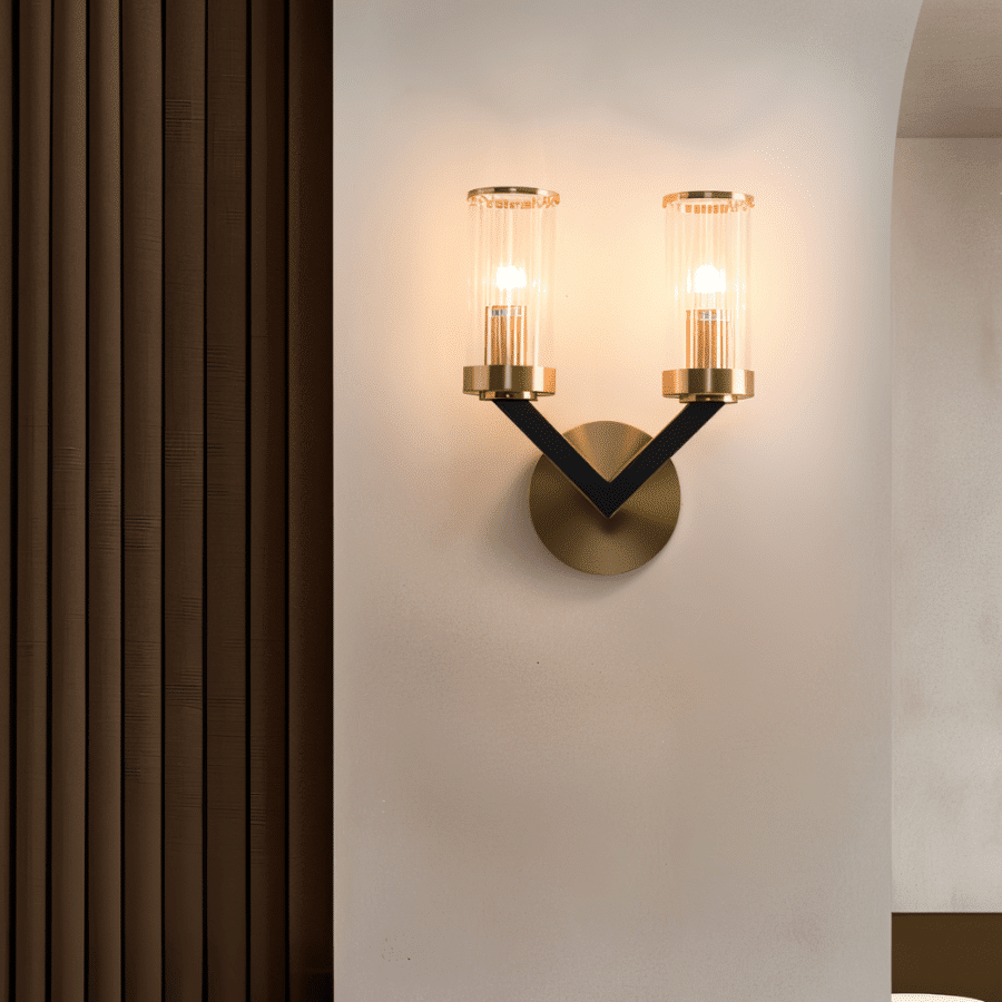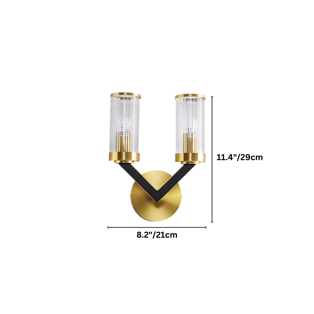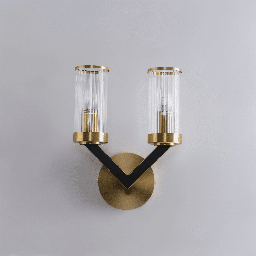 This light fixture showcases a striking V-shaped design with a dual-arm structure in matte black, anchored by a round brushed gold base. Each arm supports a cylindrical clear glass shade trimmed in polished copper-gold, enhancing the fixture’s modern yet opulent aesthetic. The transparency of the glass reveals the bulb architecture, adding an industrial-chic detail. Ideal for installation in hallways, living rooms, or vanity spaces, it brings symmetry and elegance to vertical surfaces. Crafted from premium copper and glass, the Sovra Wall Lamp ensures both durability and visual impact.