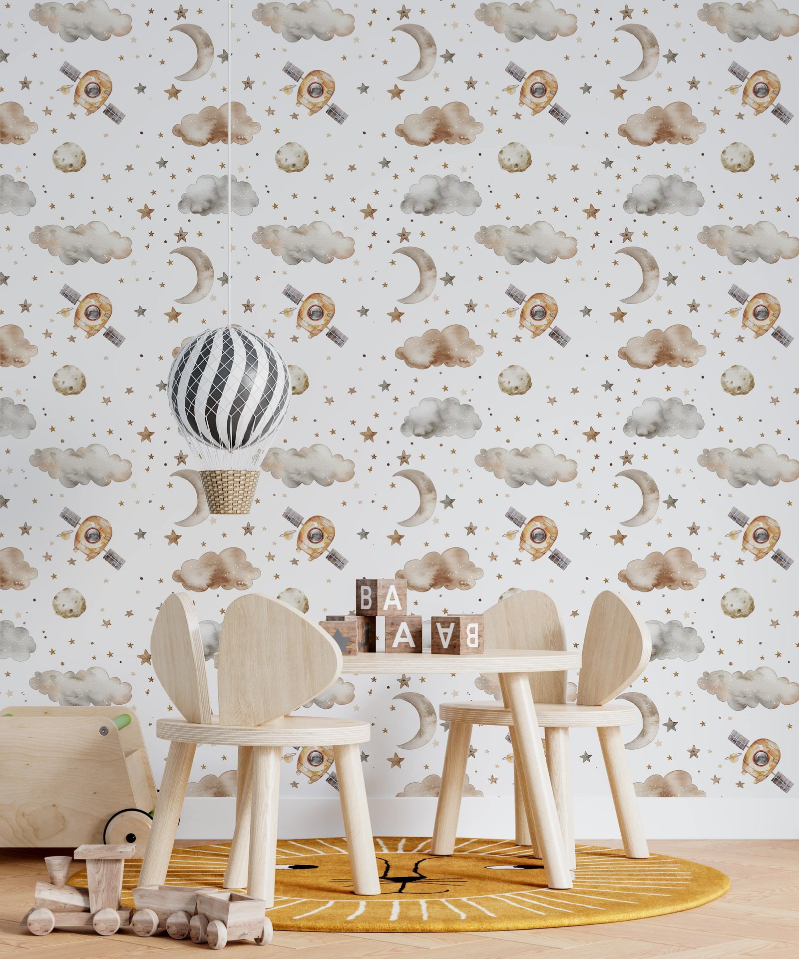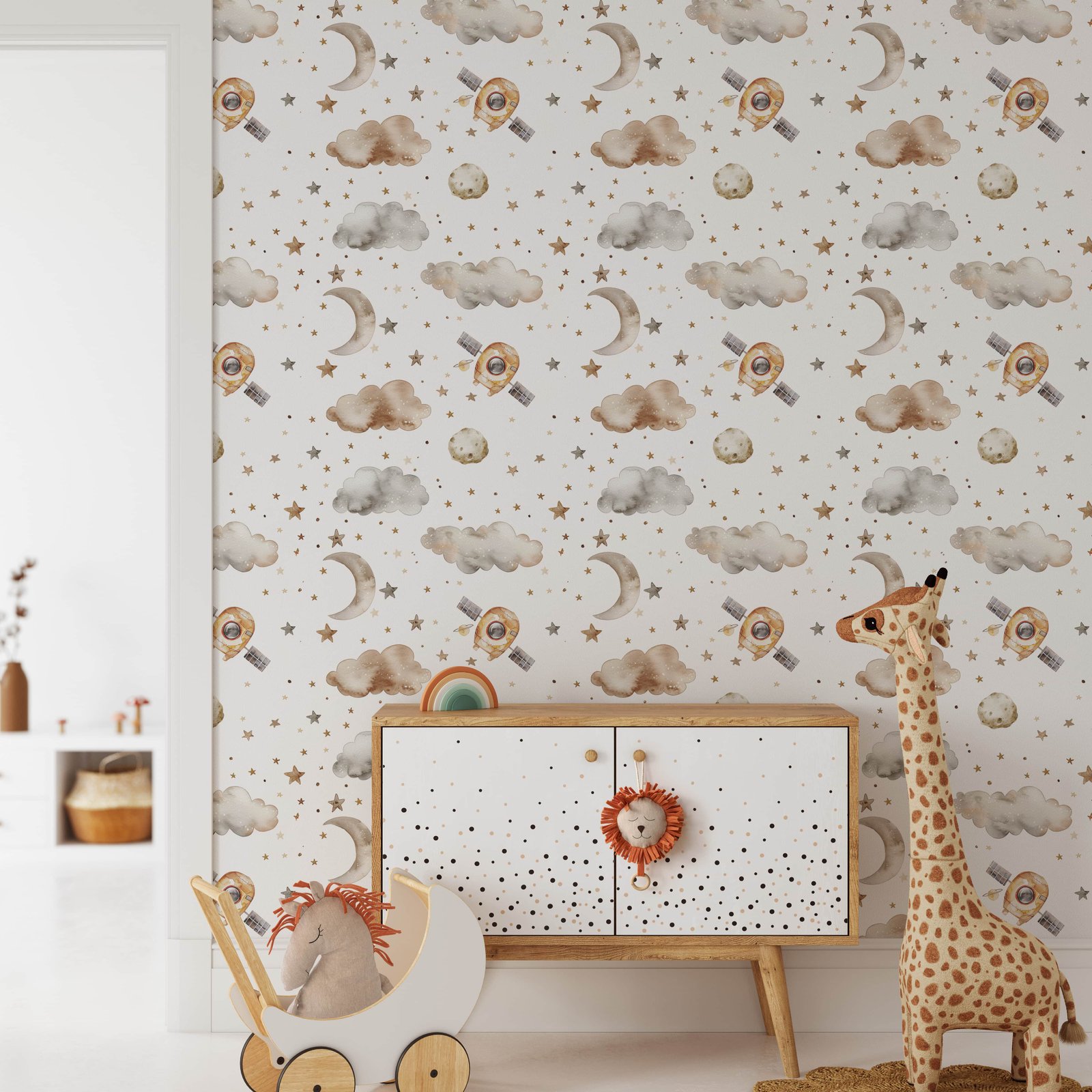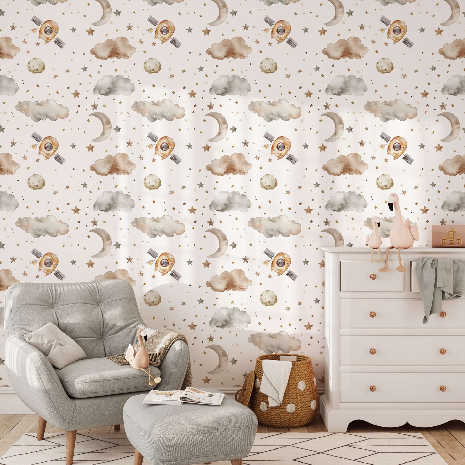 Ignite your child’s imagination with our Spaceship Adventure Nursery Wallpaper, featuring whimsical illustrations of clouds, stars, and flying asteroids in soft watercolor tones. The gentle palette of beige, gray, and brown creates a peaceful and dreamy atmosphere, perfect for boys room, playrooms, or children’s bedrooms.