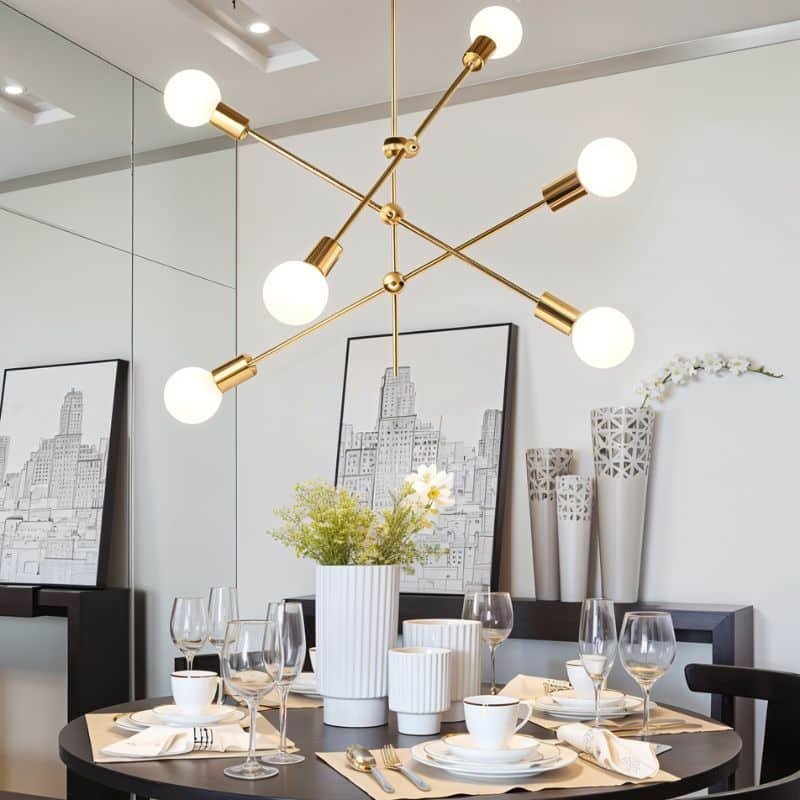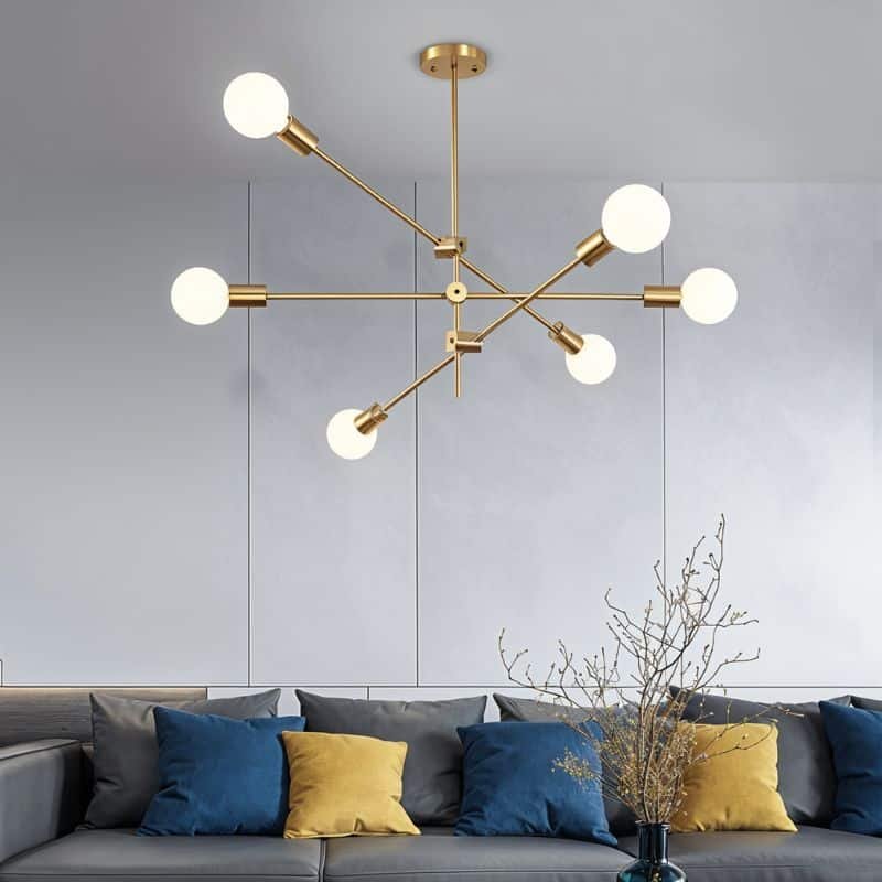 The Sunburst Chandelier adds a touch of mid-century modern style to your house and is a chic replacement for traditional lighting fixtures. Its high-quality iron construction and design of intersecting slender rods make up the bulk of the frame with lights at their ends enabling the light to radiate without glare and evenly in all directions. The Sunburst comes in a range of head styles and has a gorgeous brass gold finish that gives it an opulent appearance. It is a semi-flush mounted chandelier and offers a stylish and timeless way to brighten up your space.