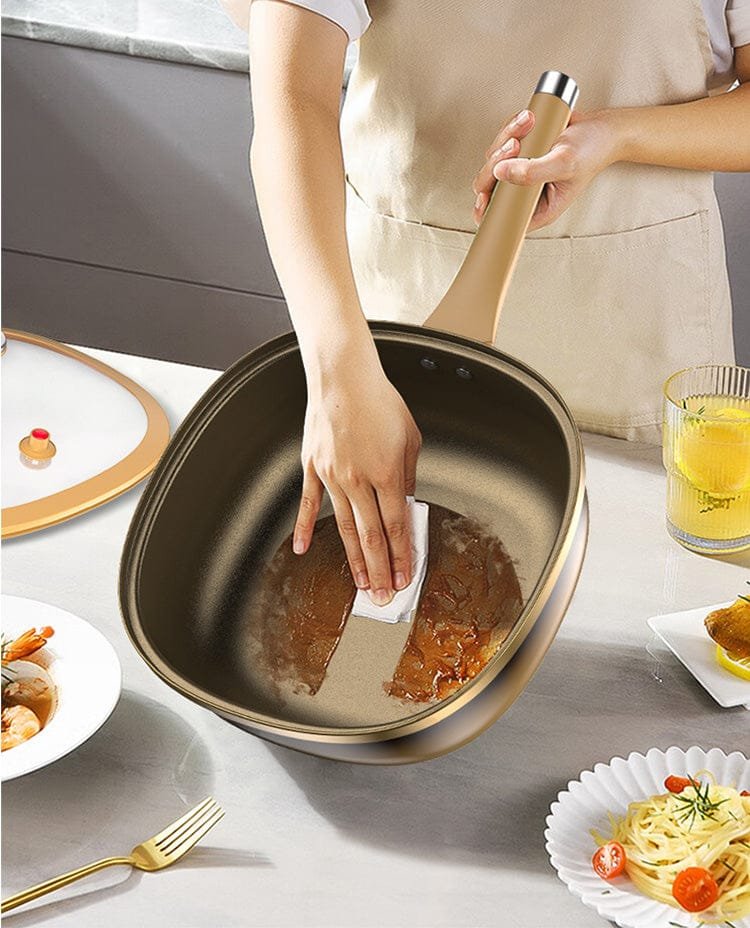 HIGH-GRADE DURABILITY – A titanium alloy base sandwiched with fine iron ensures even heat distribution and warp resistance. Ceramic coating won’t peel even with metal utensils, while food-grade silicone seals prevent steam leaks.