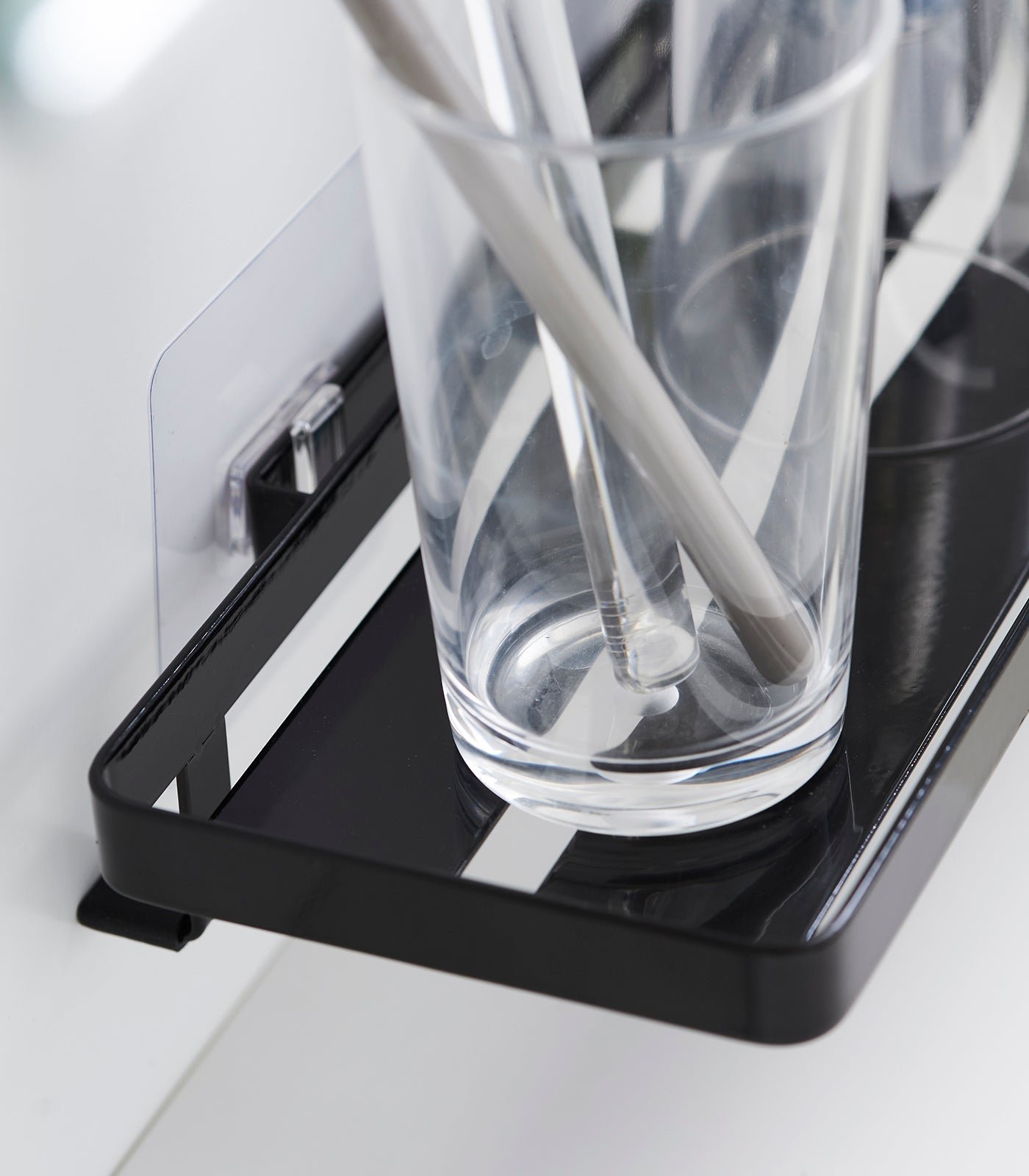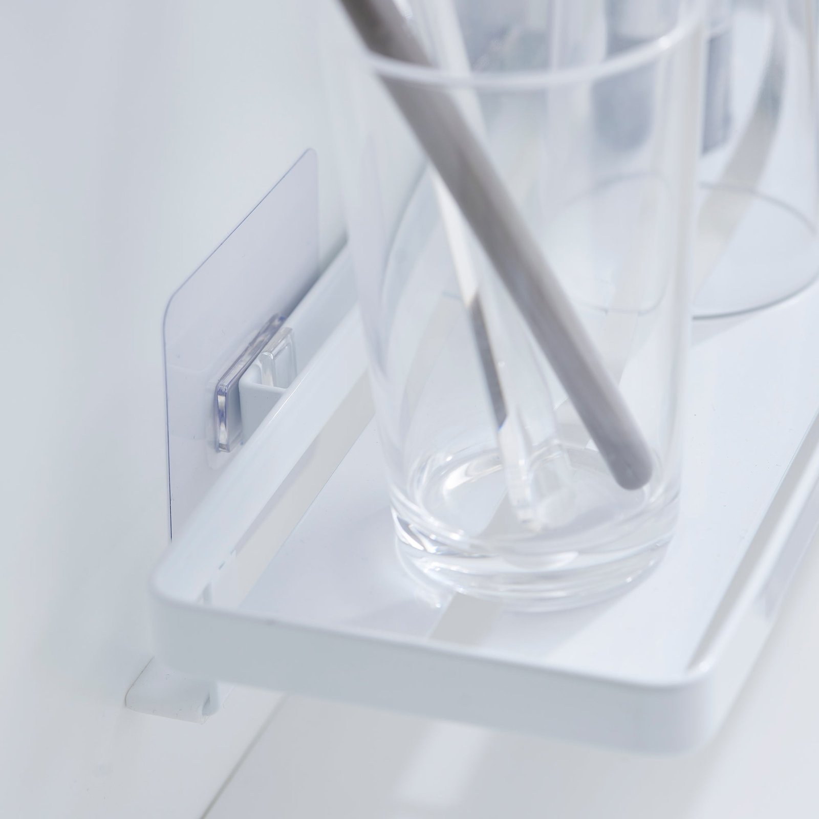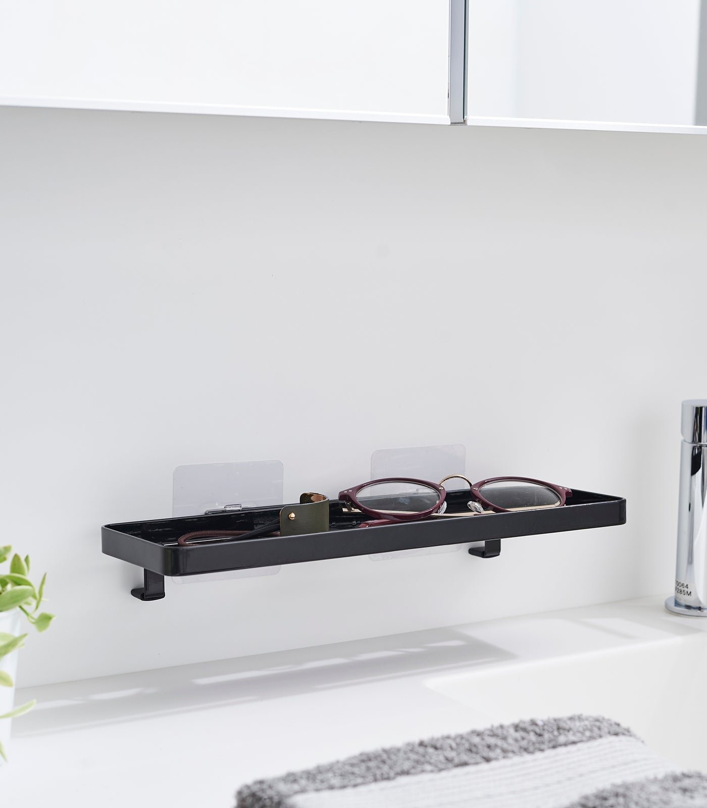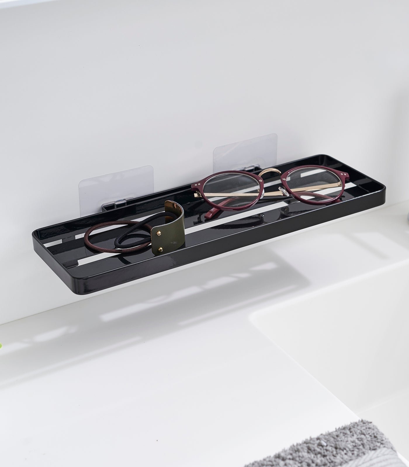 Floating storage in an instant. Need a little more bathroom storage? This floating tray doesn’t require any hardware, and can be mounted onto tiles, glass, and other smooth surfaces without damaging your walls. Create extra storage for various toiletries without cluttering the sink area. Despite its chic appearance, this surprisingly sturdy solution can support up to 4.4 pounds! Check our installation guide for best results.