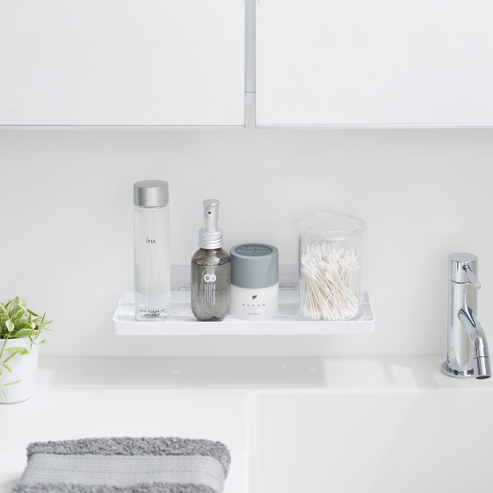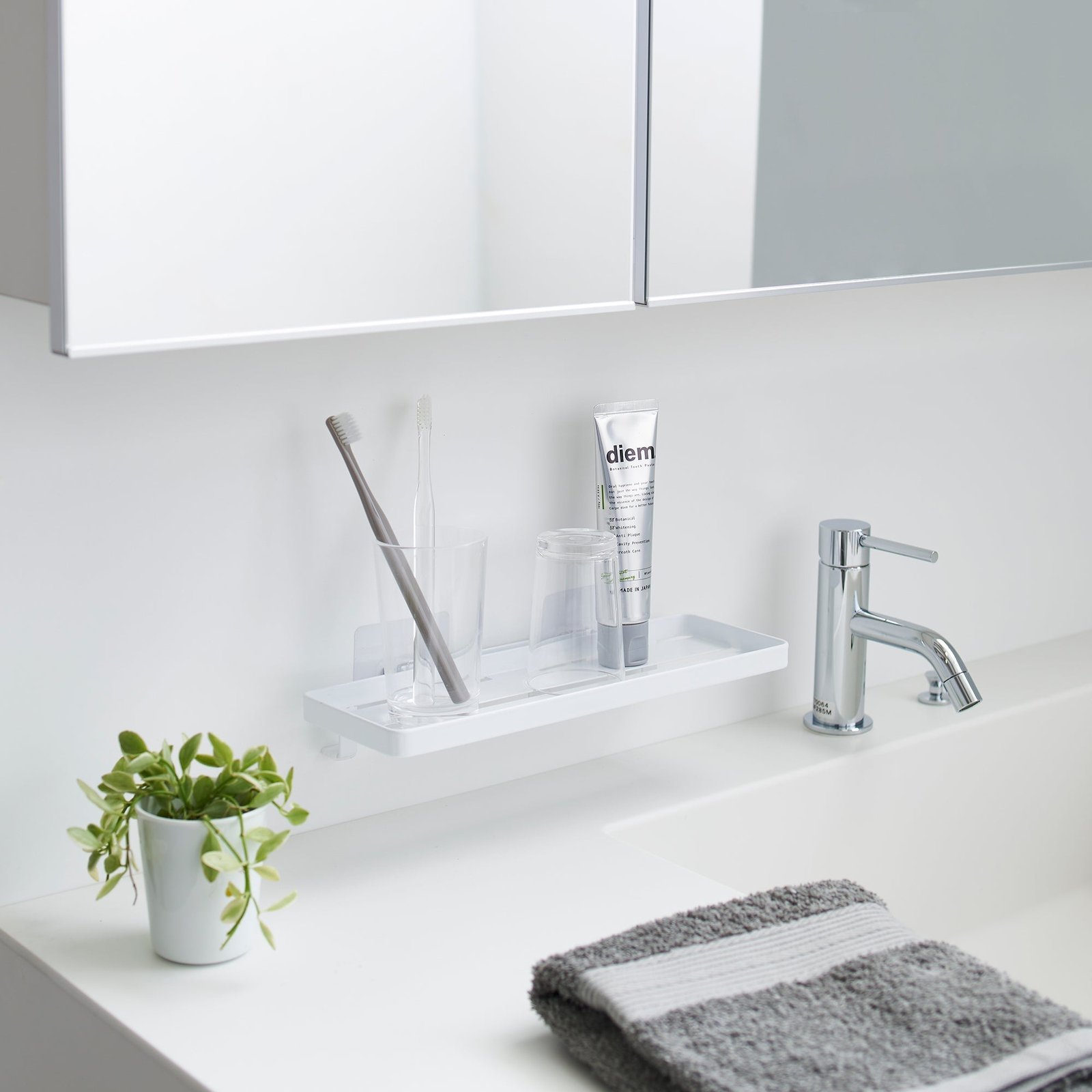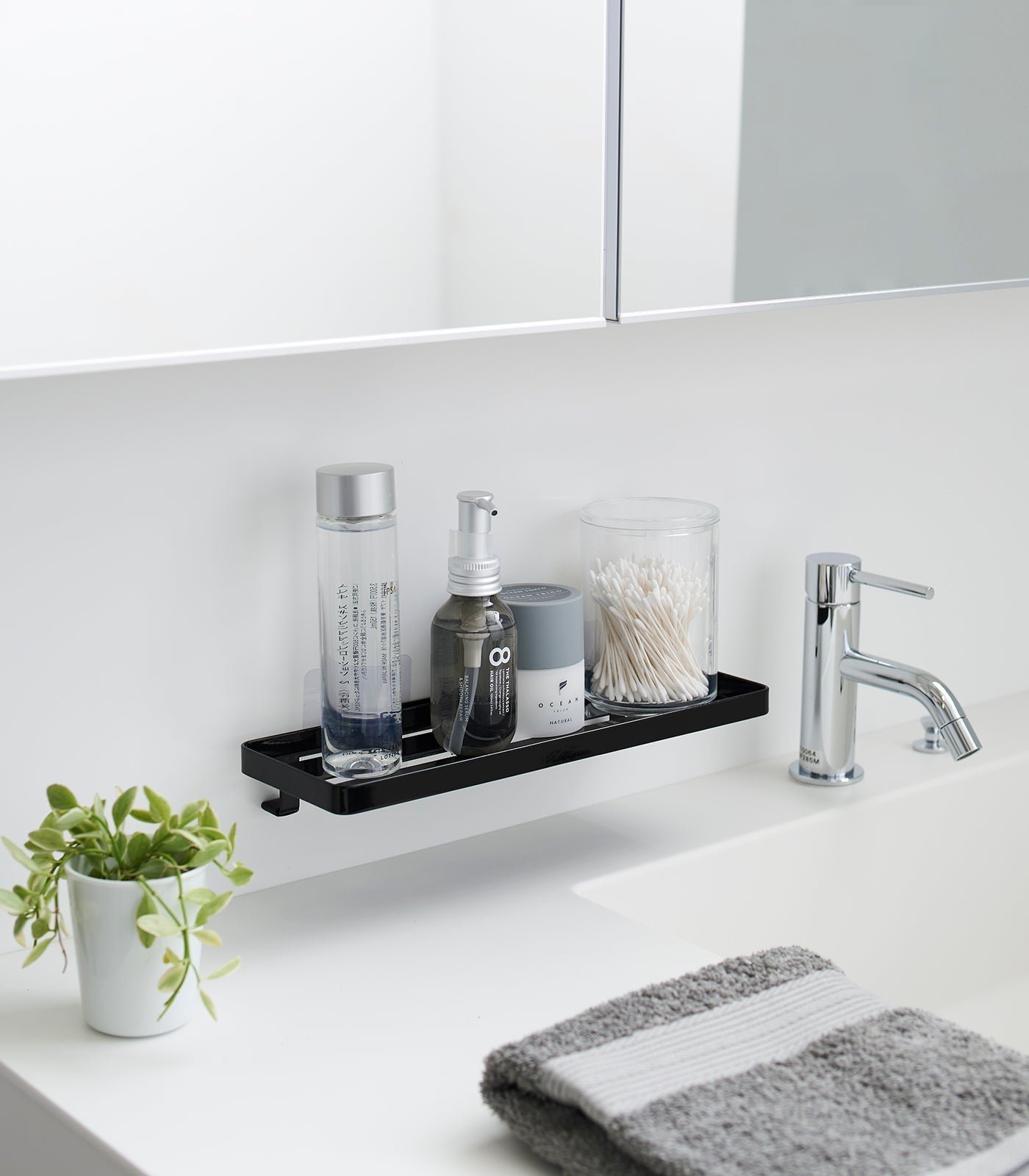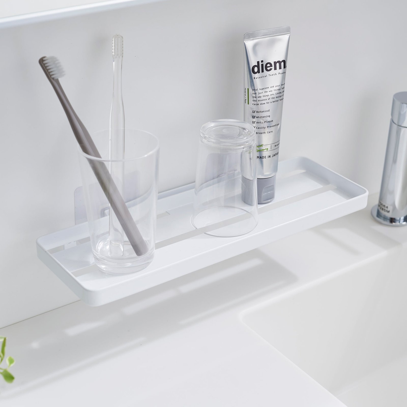 Floating storage in an instant. Need a little more bathroom storage? This floating tray doesn’t require any hardware, and can be mounted onto tiles, glass, and other smooth surfaces without damaging your walls. Create extra storage for various toiletries without cluttering the sink area. Despite its chic appearance, this surprisingly sturdy solution can support up to 4.4 pounds! Check our installation guide for best results.