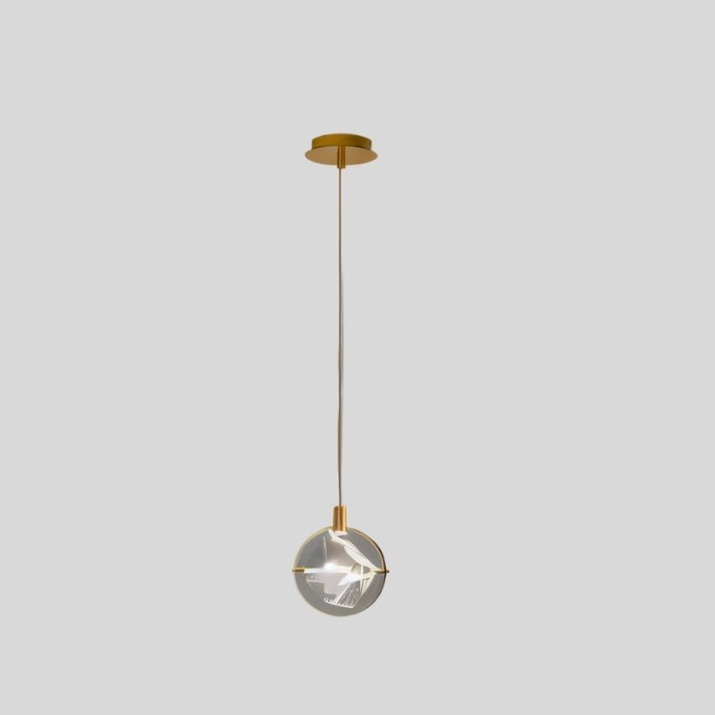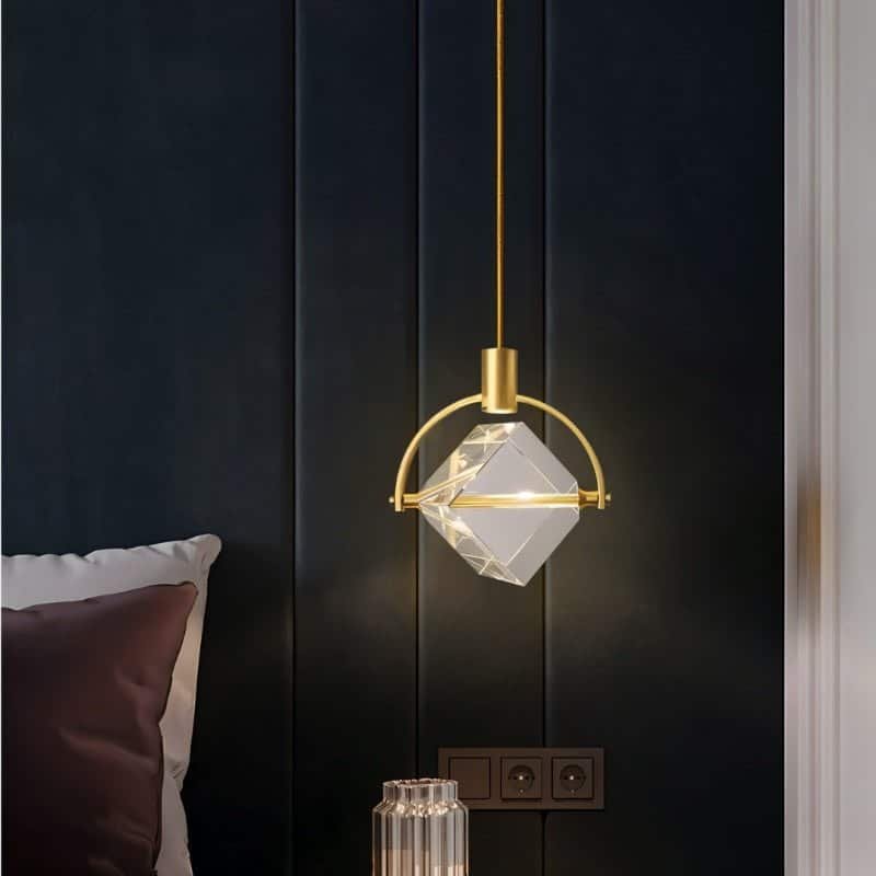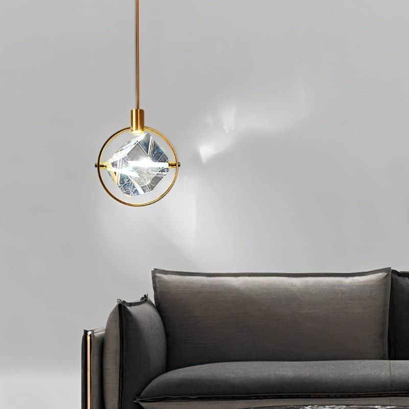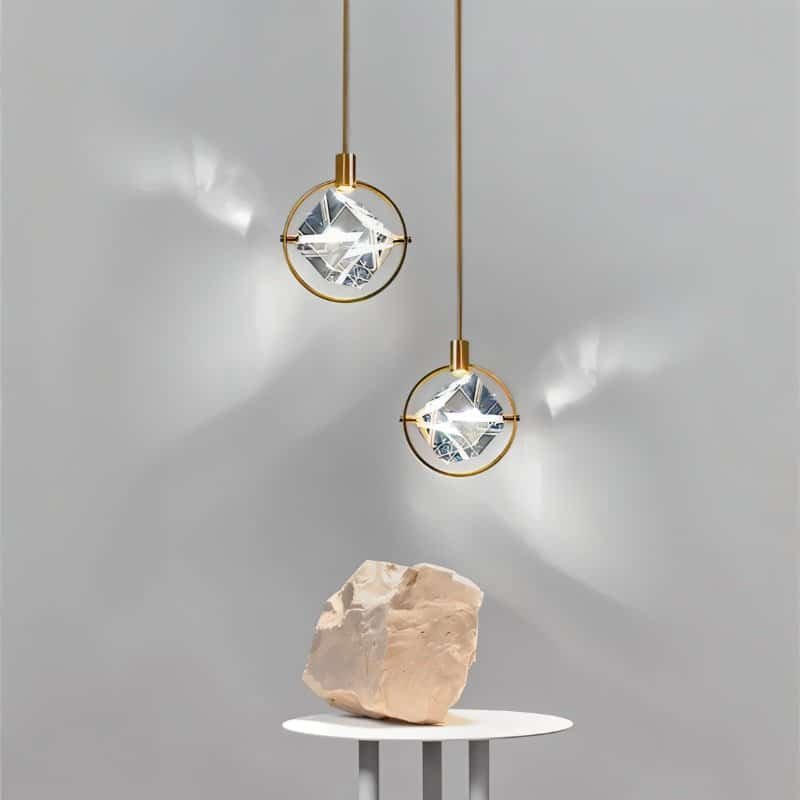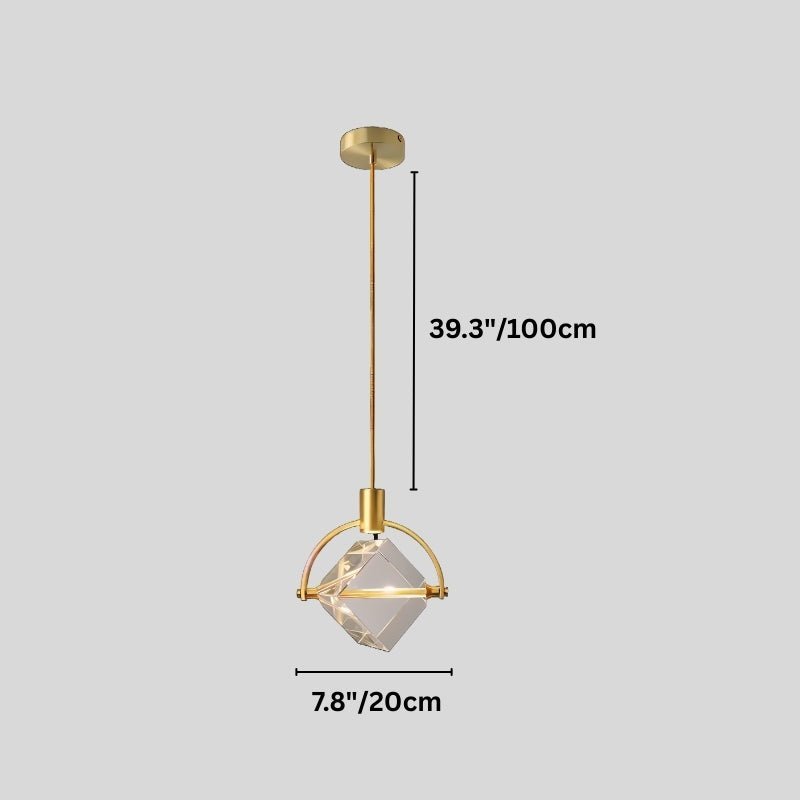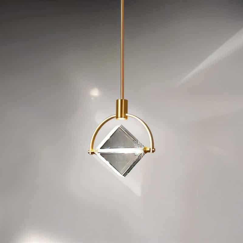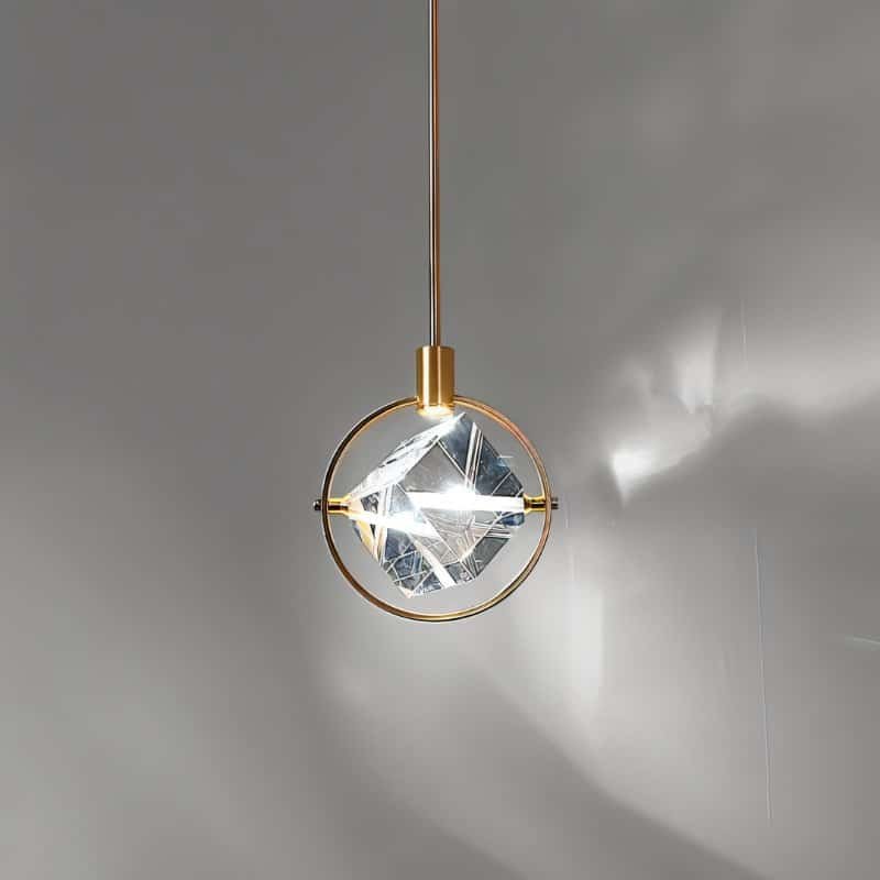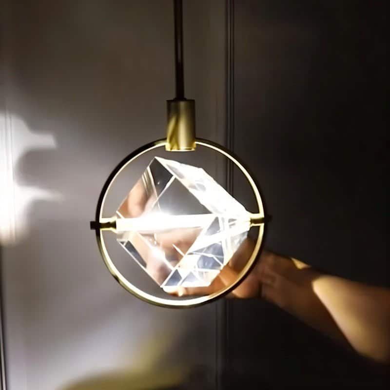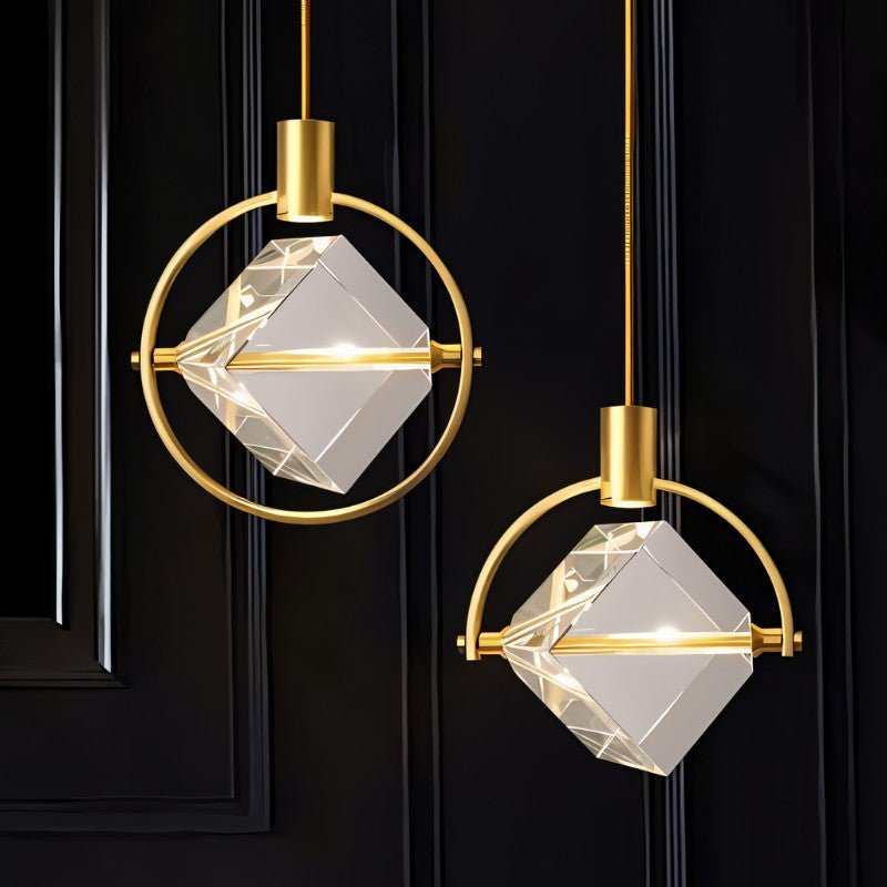 The Valvo pendant light is a modern light fixture featuring an elegant circular iron frame with a suspended crystal cube. The transparent crystal refracts light beautifully, creating striking ambient effects. The minimalist gold finish complements contemporary and luxury interiors. Ideal for dining areas, living rooms, bedrooms, or high-end commercial spaces, this pendant light enhances any setting with its sophisticated design and focused illumination. Its adjustable suspension allows versatile installation, making it a statement piece in modern lighting décor.