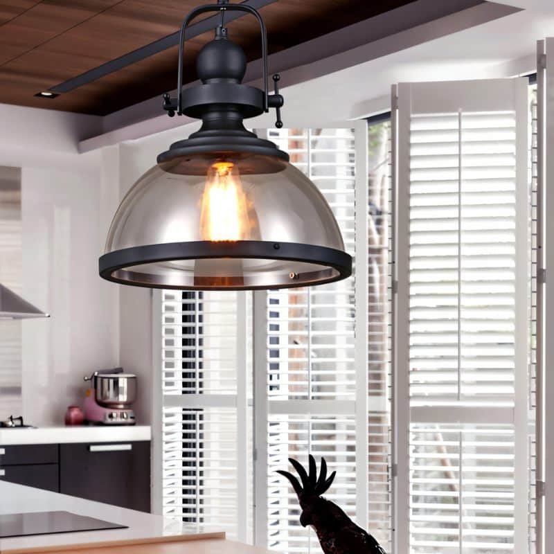 The Vatik pendant light is a vintage-industrial light fixture featuring a black metal frame and a clear glass dome. Its exposed bulb design enhances illumination, creating a warm, ambient glow. The sturdy metal construction ensures durability, while the transparent glass shade offers a refined aesthetic. Suspended by an adjustable chain, this pendant light is ideal for dining rooms, kitchens, cafes, and loft-style interiors, adding a timeless, rustic charm to any space.